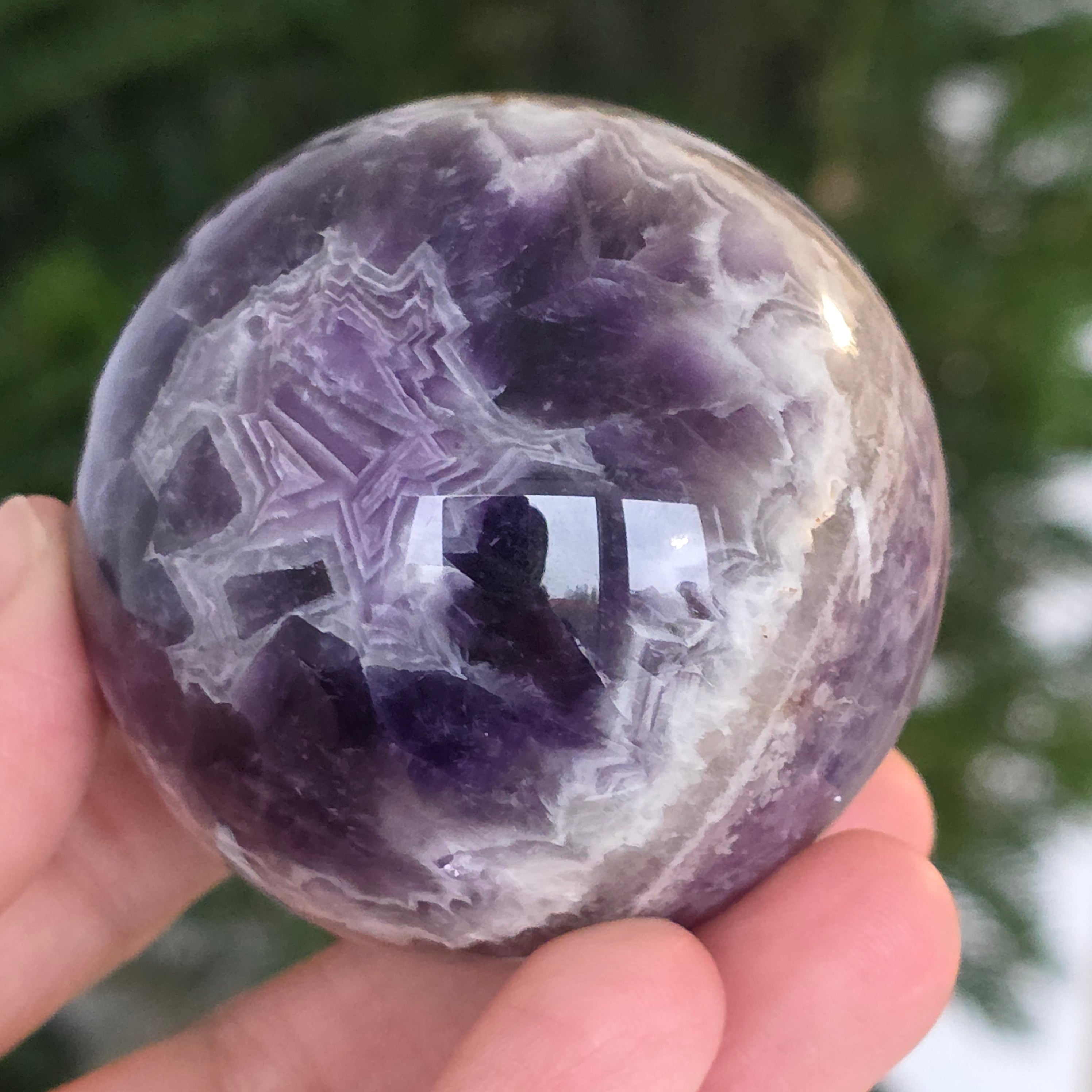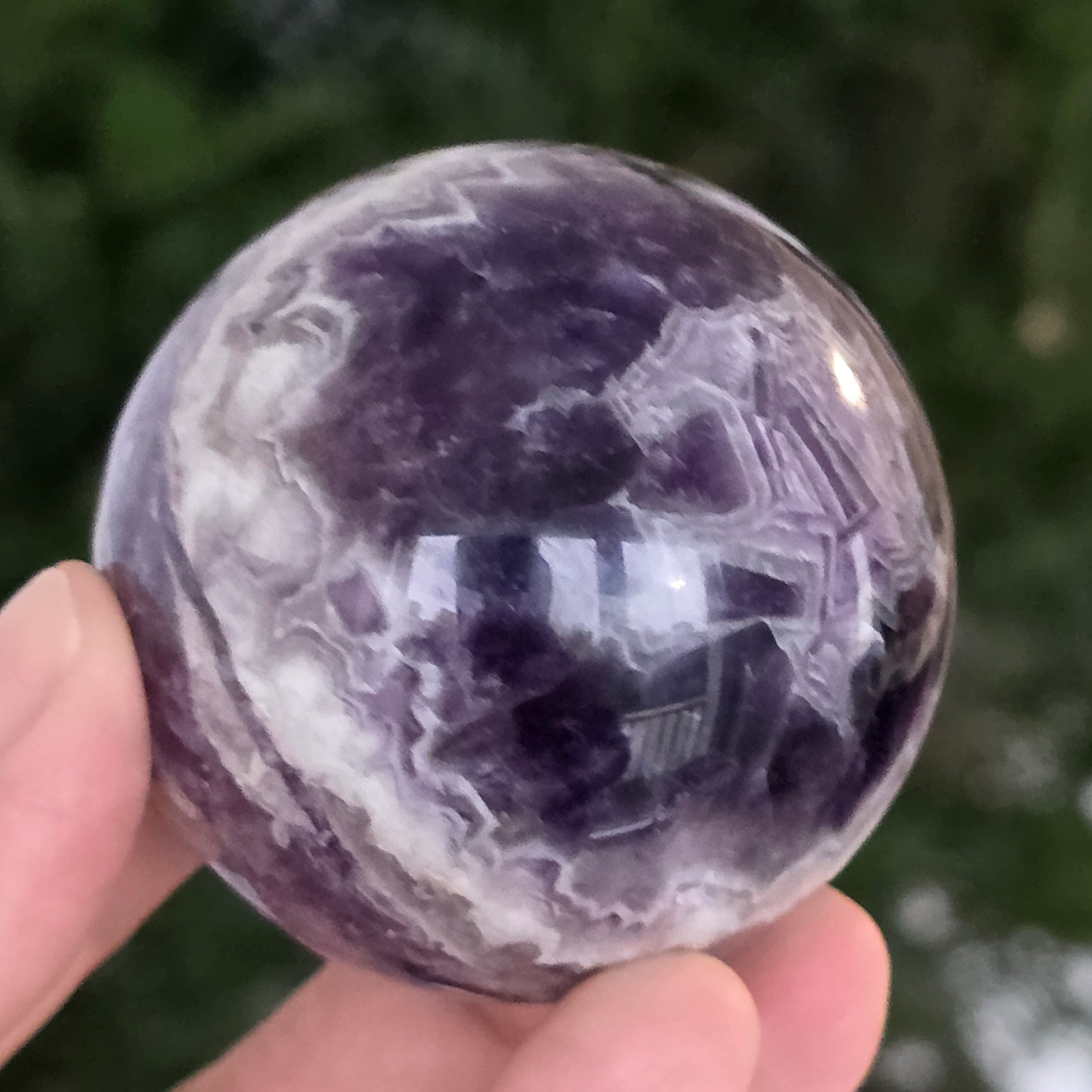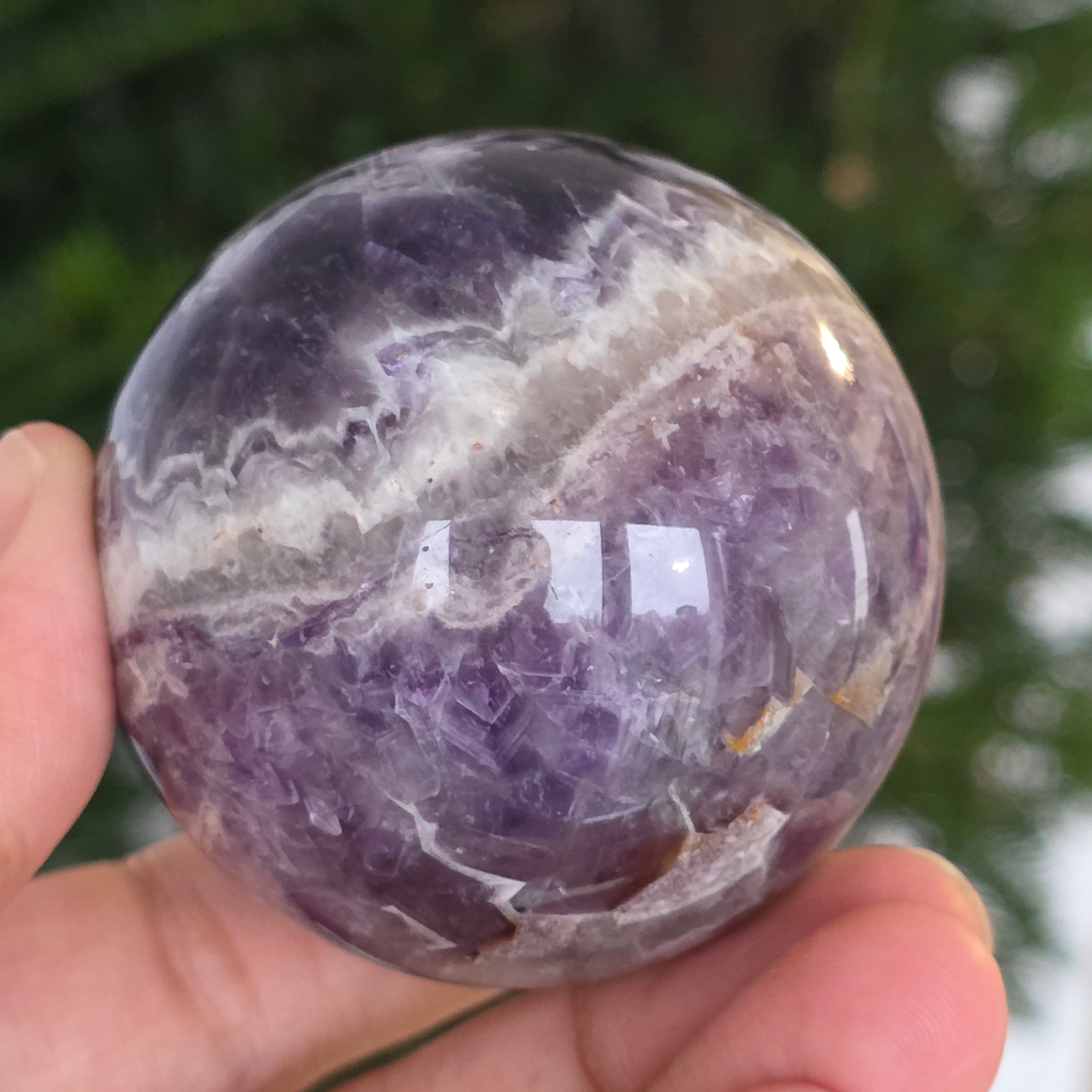 O sferă ce pare să concentreze în interior lumina unei nopți liliachii. Această piesă unicat din ametist chevron natural, dezvăluie straturi uimitoare de violet, alb și lavandă, dispuse în forme în V – semnul distinctiv al acestei varietăți rare de ametist. Suprafața perfect șlefuită, catifelată la atingere, oglindește lumina cu o finețe hipnotică, aducând liniște și rafinament în orice spațiu.