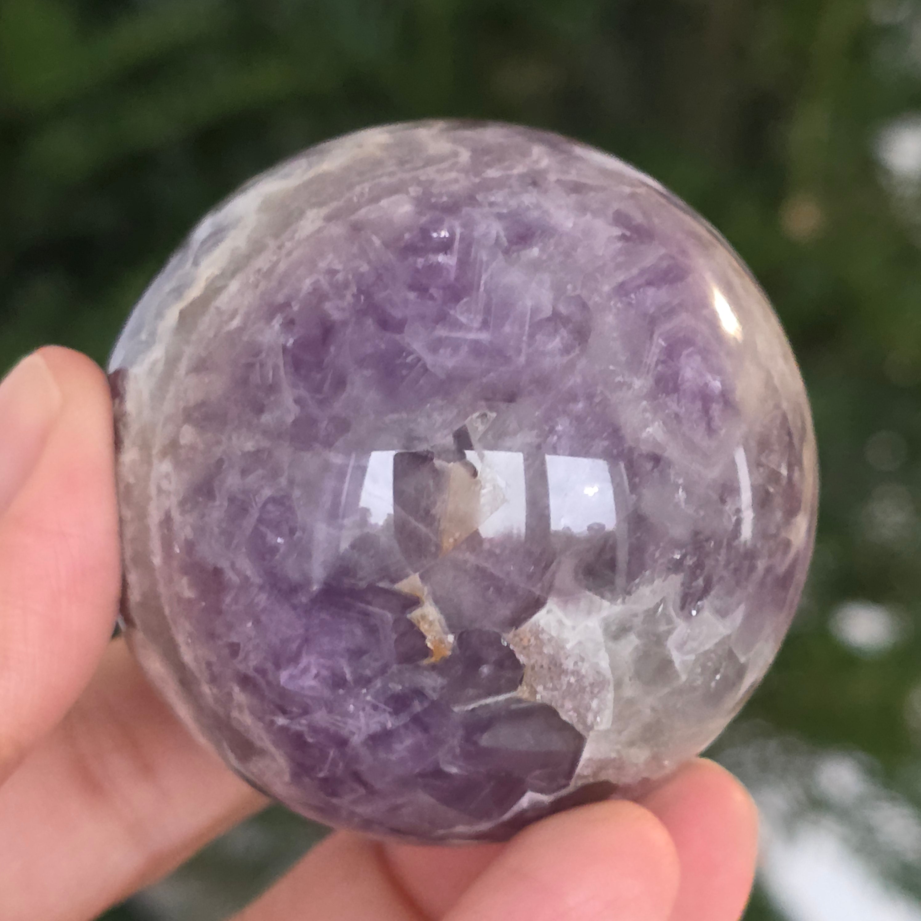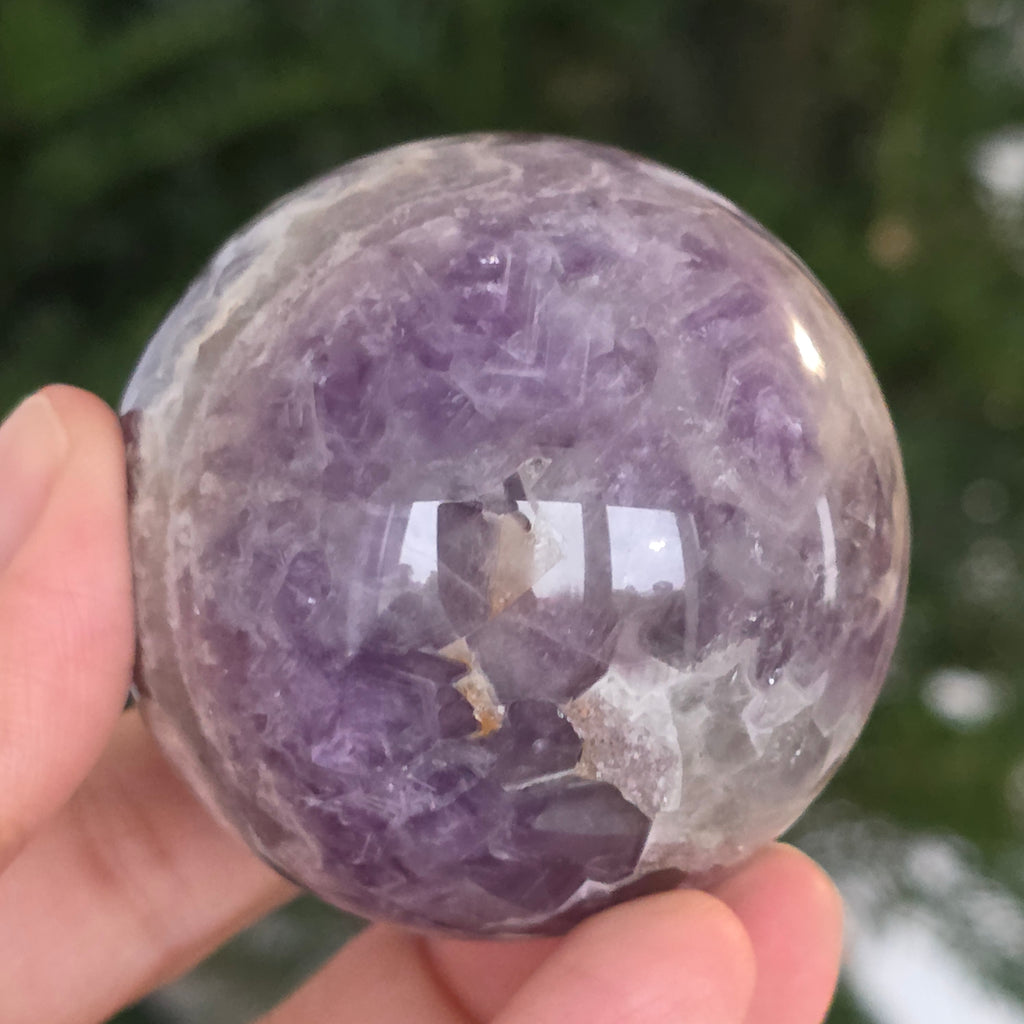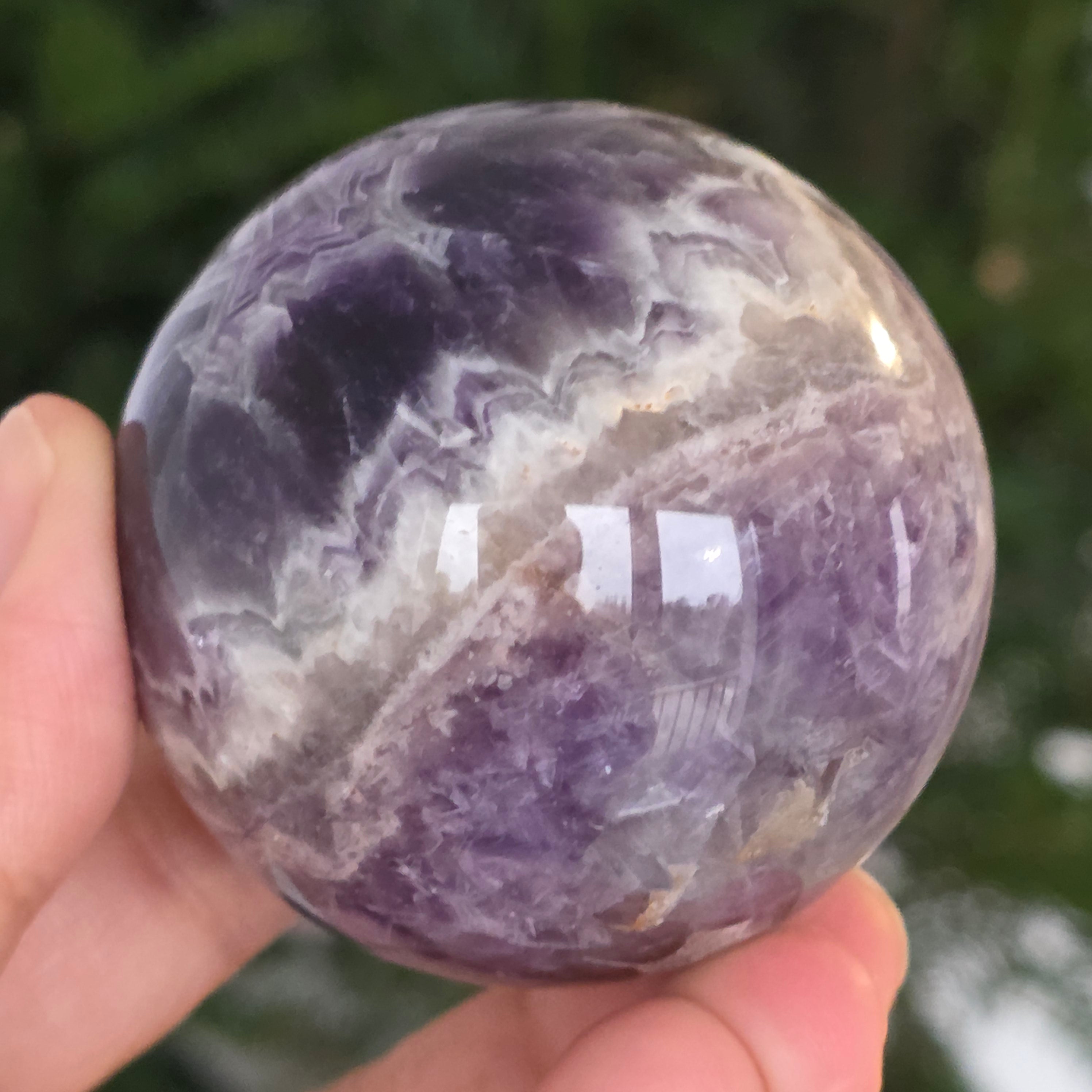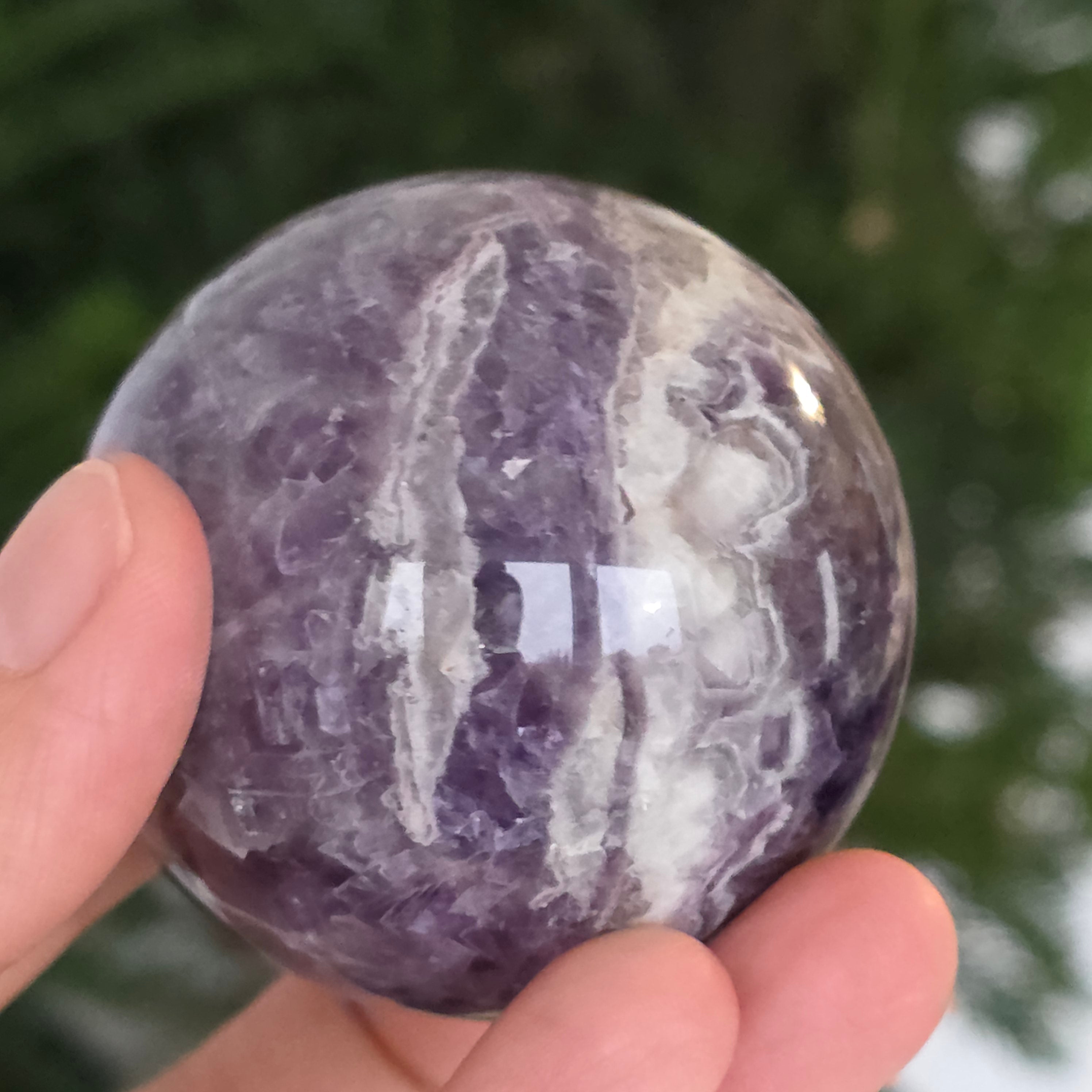 O sferă ce pare să concentreze în interior lumina unei nopți liliachii. Această piesă unicat din ametist chevron natural, dezvăluie straturi uimitoare de violet, alb și lavandă, dispuse în forme în V – semnul distinctiv al acestei varietăți rare de ametist. Suprafața perfect șlefuită, catifelată la atingere, oglindește lumina cu o finețe hipnotică, aducând liniște și rafinament în orice spațiu.