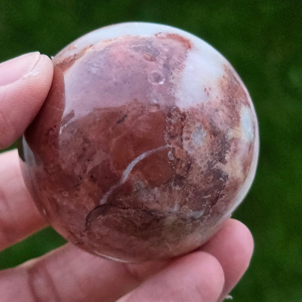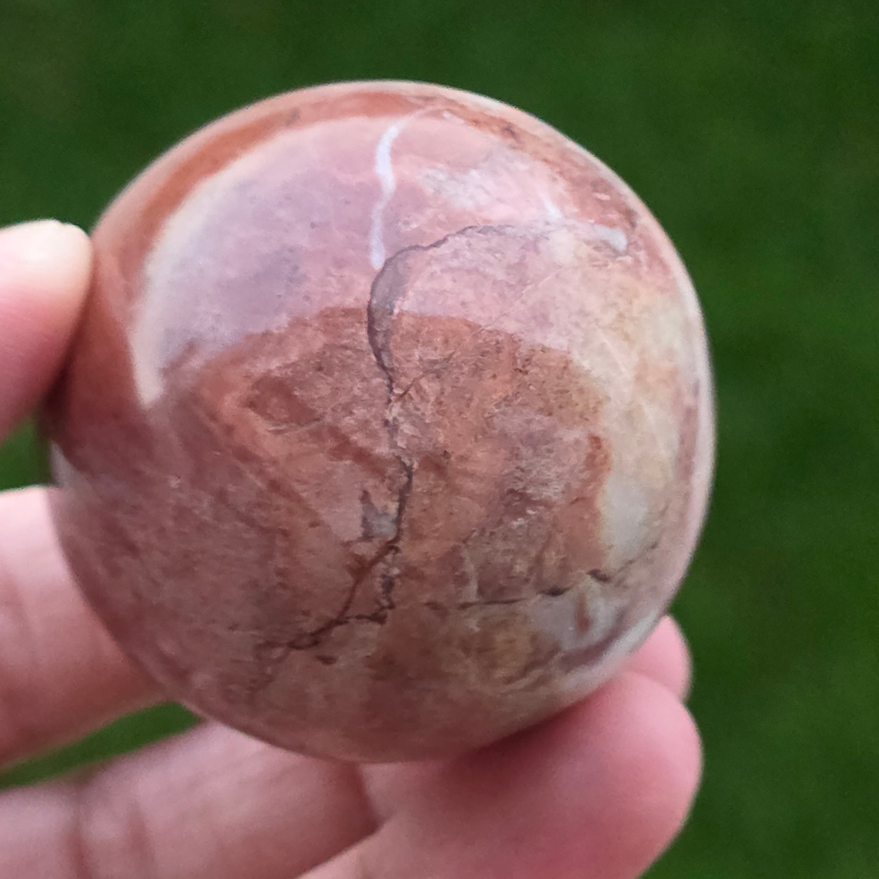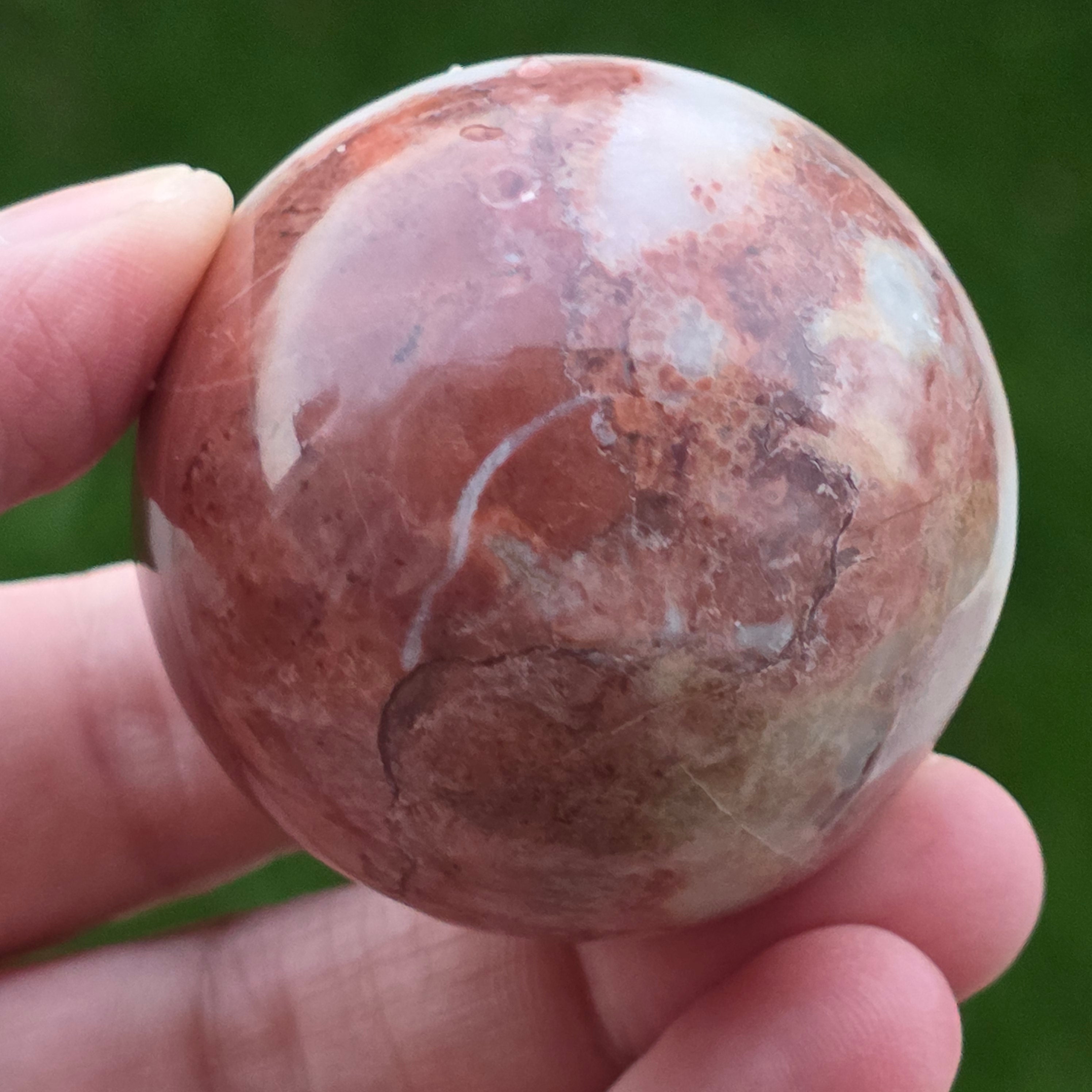 Sfera din Jasp Căpșună este o piesă vibrantă și expresivă, sculptată cu atenție pentru a evidenția nuanțele calde de roșu căpșună, texturile organice și desenul mineral specific acestei varietăți de jasp. Fiecare piesă este complet unică, cu modele naturale care se împletesc în forme fluide, evocând stratificarea rocilor și frumusețea lor brută.