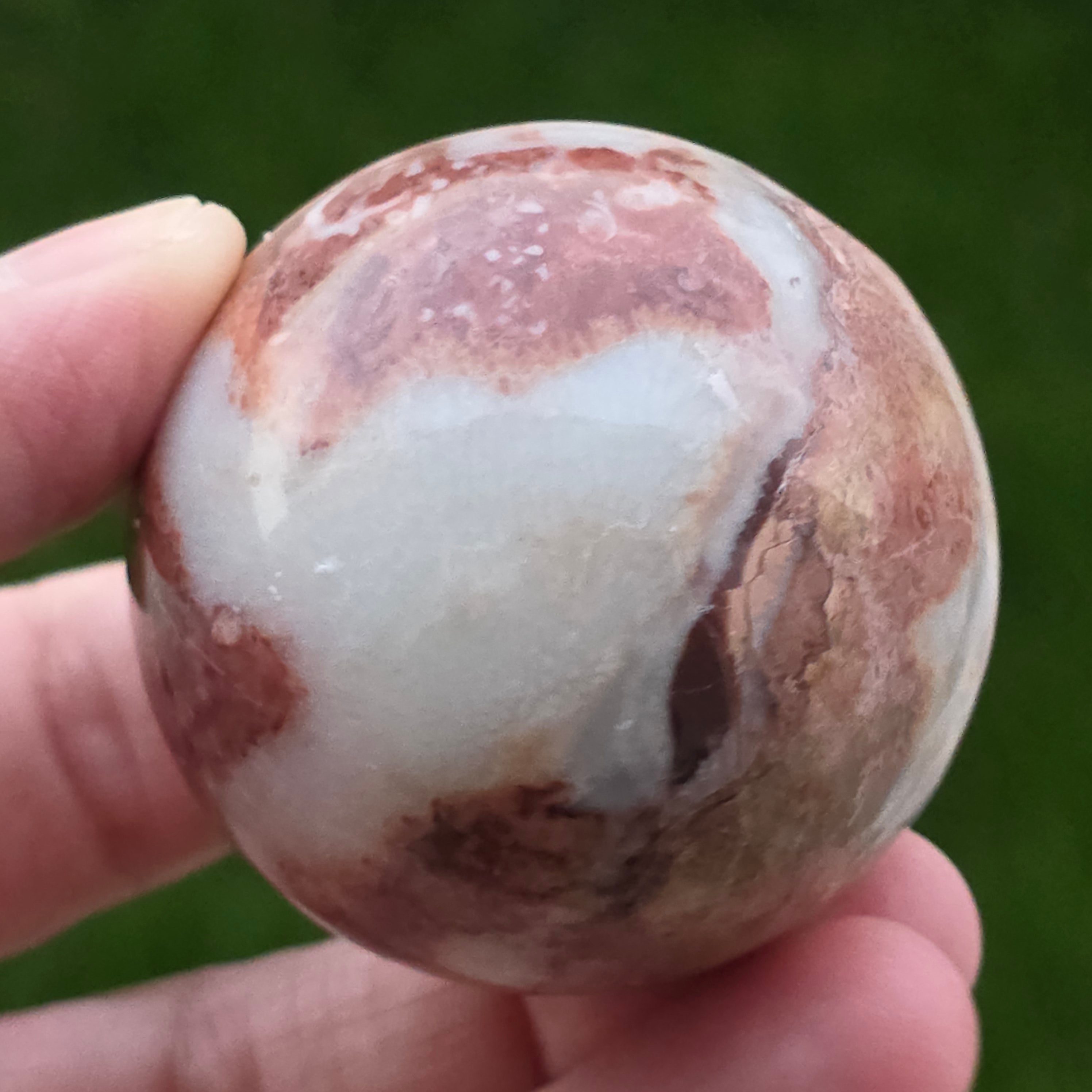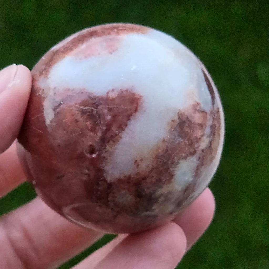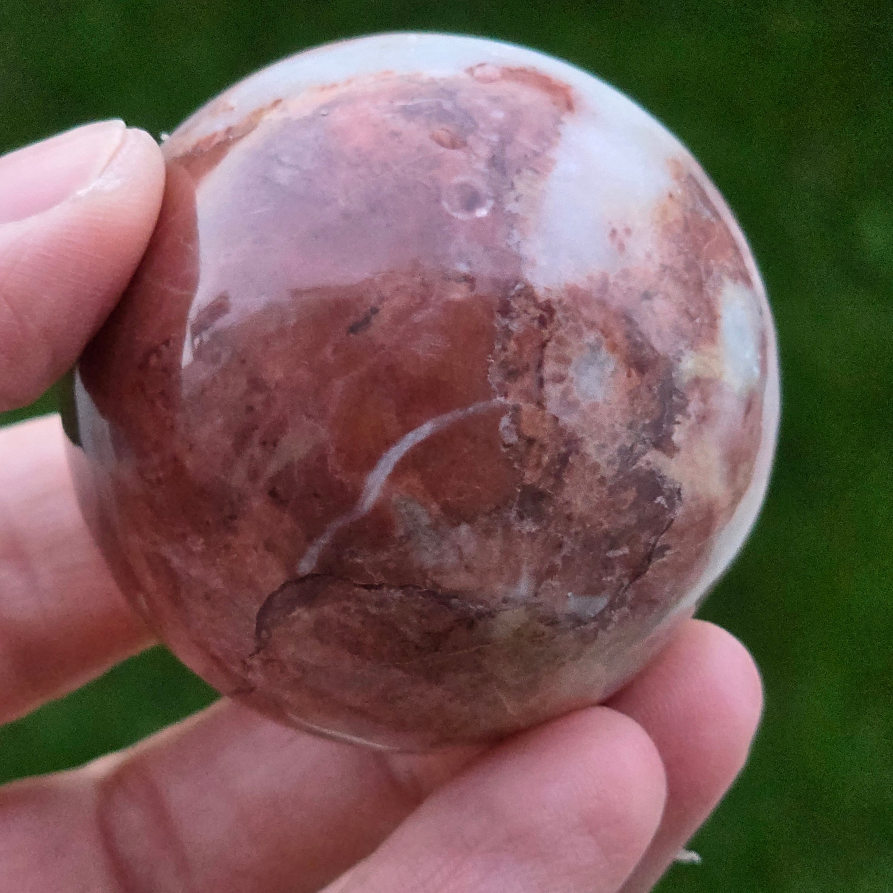 Sfera din Jasp Căpșună este o piesă vibrantă și expresivă, sculptată cu atenție pentru a evidenția nuanțele calde de roșu căpșună, texturile organice și desenul mineral specific acestei varietăți de jasp. Fiecare piesă este complet unică, cu modele naturale care se împletesc în forme fluide, evocând stratificarea rocilor și frumusețea lor brută.