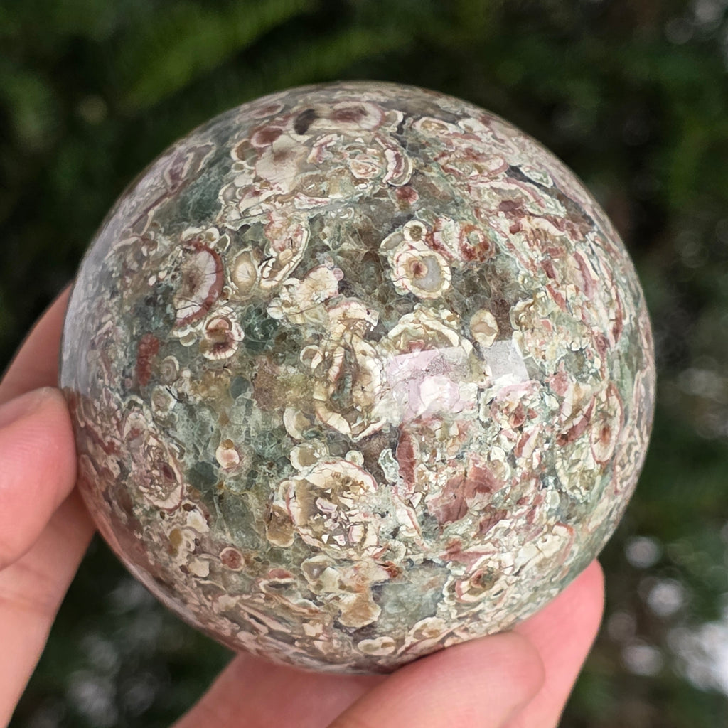 O sferă care poartă în ea urmele unei planete în formare. Texturile vii și culorile pământii ale riolitului natural – nuanțe de verde mușchi, bej, brun și gri vulcanic – se împletesc într-un dans hipnotic de forme și linii, ca o hartă minerală a lumii interioare.