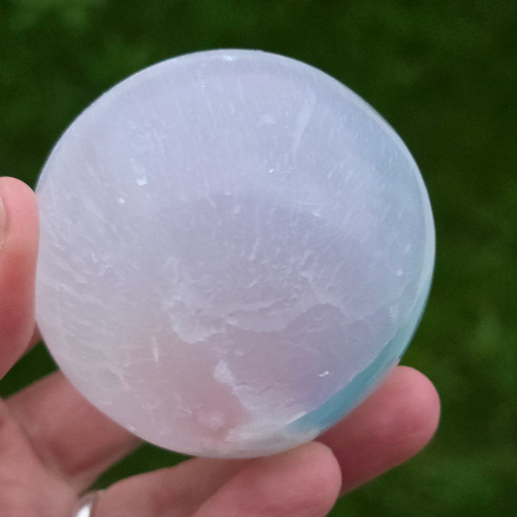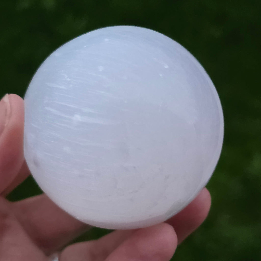 Această sfera din selenit este decorată cu simbolurile celor 7 chakre, fiecare gravat și colorat distinct, pentru a susține lucrul energetic și echilibrul interior. Selenitul este cunoscut ca piatra luminii și a purificării, fiind folosit atât pentru claritate mentală, cât și pentru curățarea altor cristale și a spațiului personal.