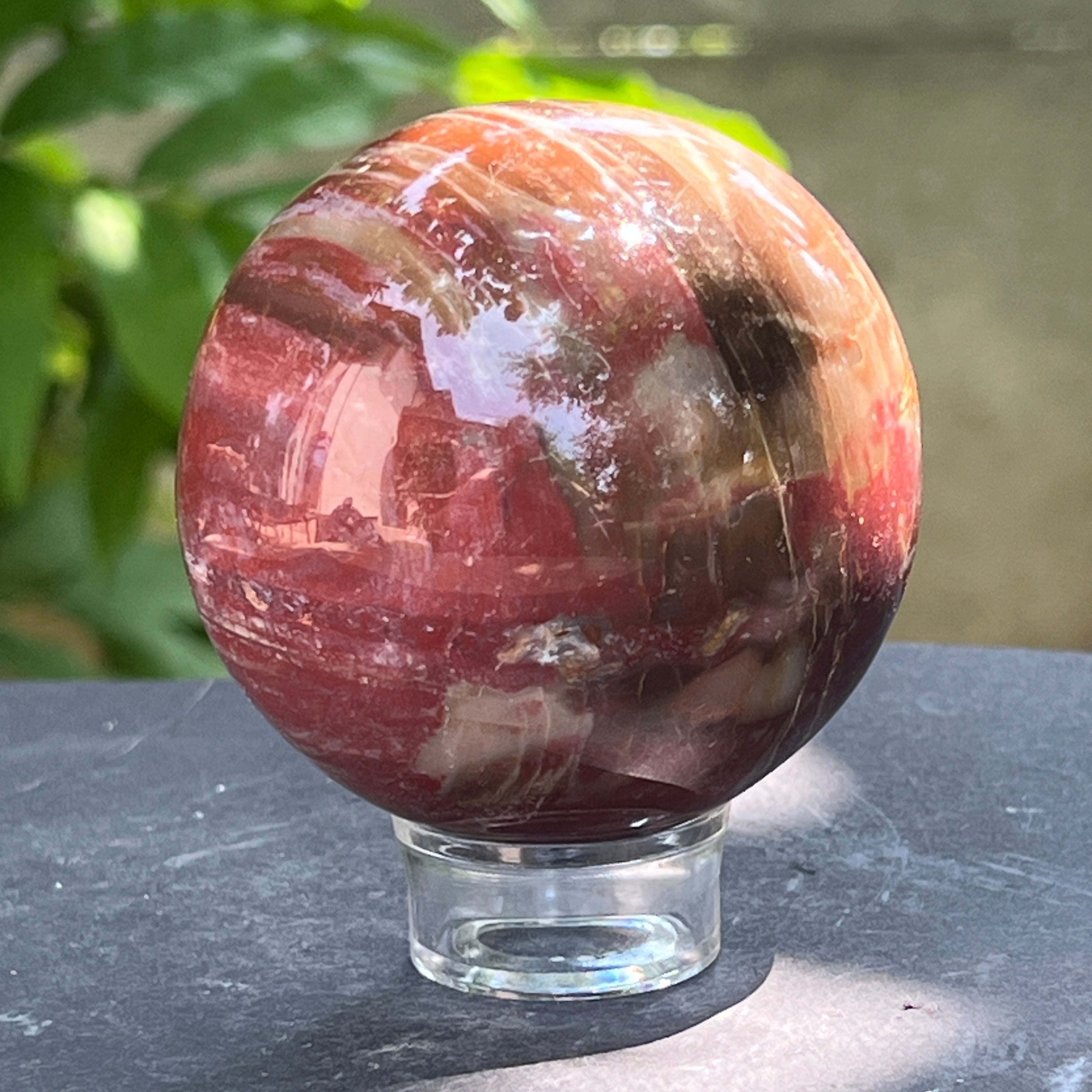 Au fil du temps, les couleurs du bois pétrifié se développent en raison des impuretés minérales: le fer ajoute des tons rouges ou oranges, le manganèse apporte des tons noirs et violets, et le cuivre peut introduire des accents verts ou bleus. Bien qu'il semble en bois à première vue, cette pierre est complètement minéralisée, ayant un Dureté mohs d'environ 6,5 - 7, similaire à celui du quartz.