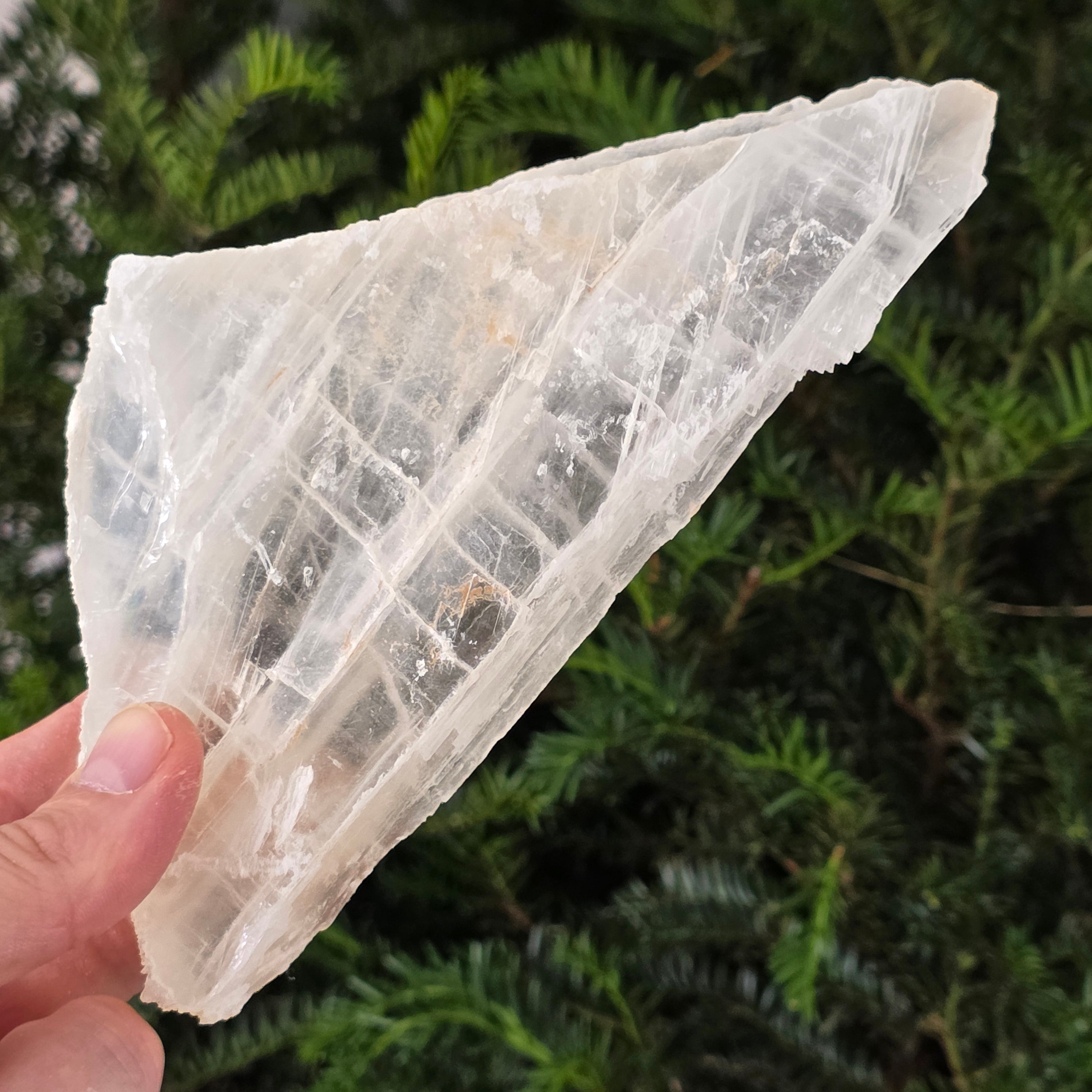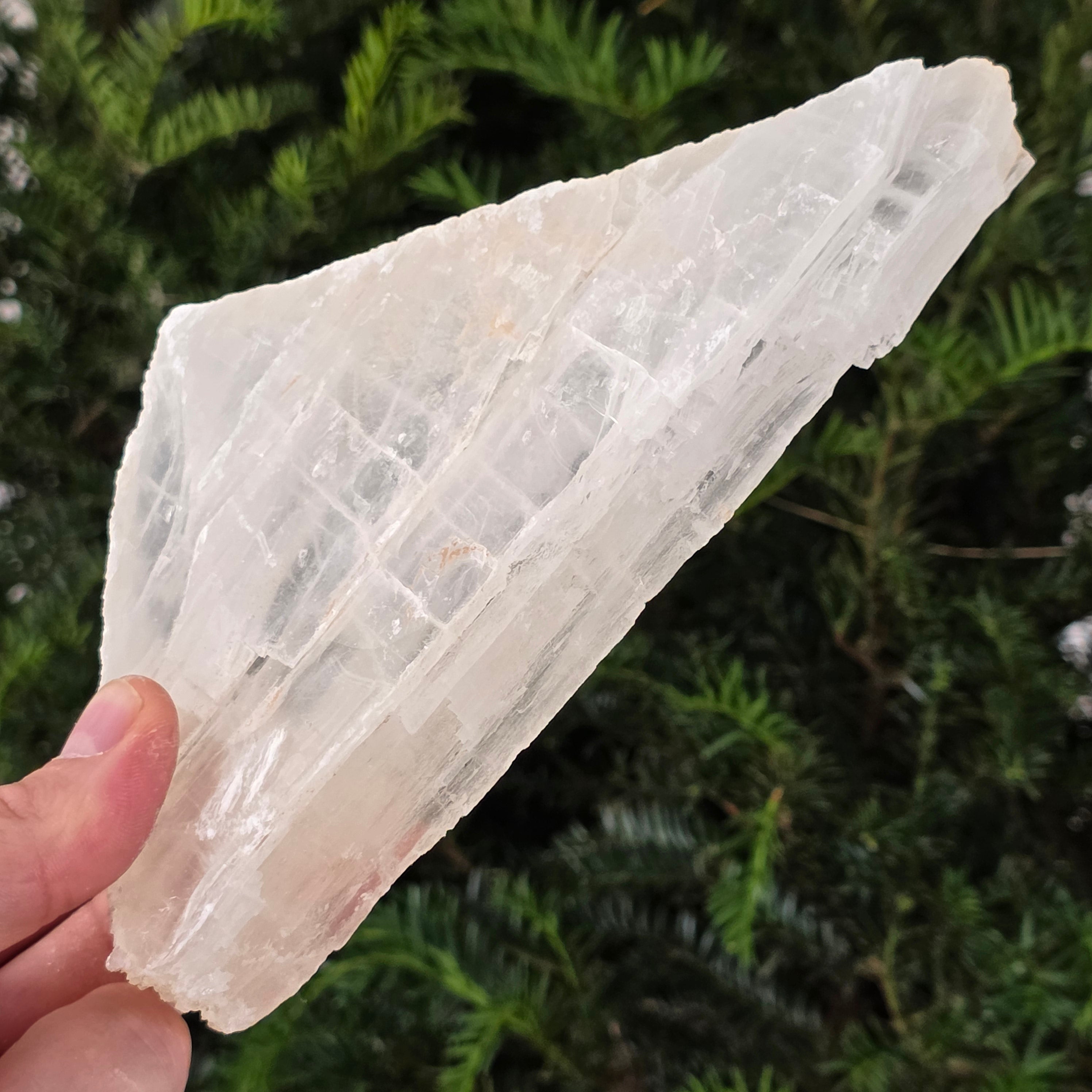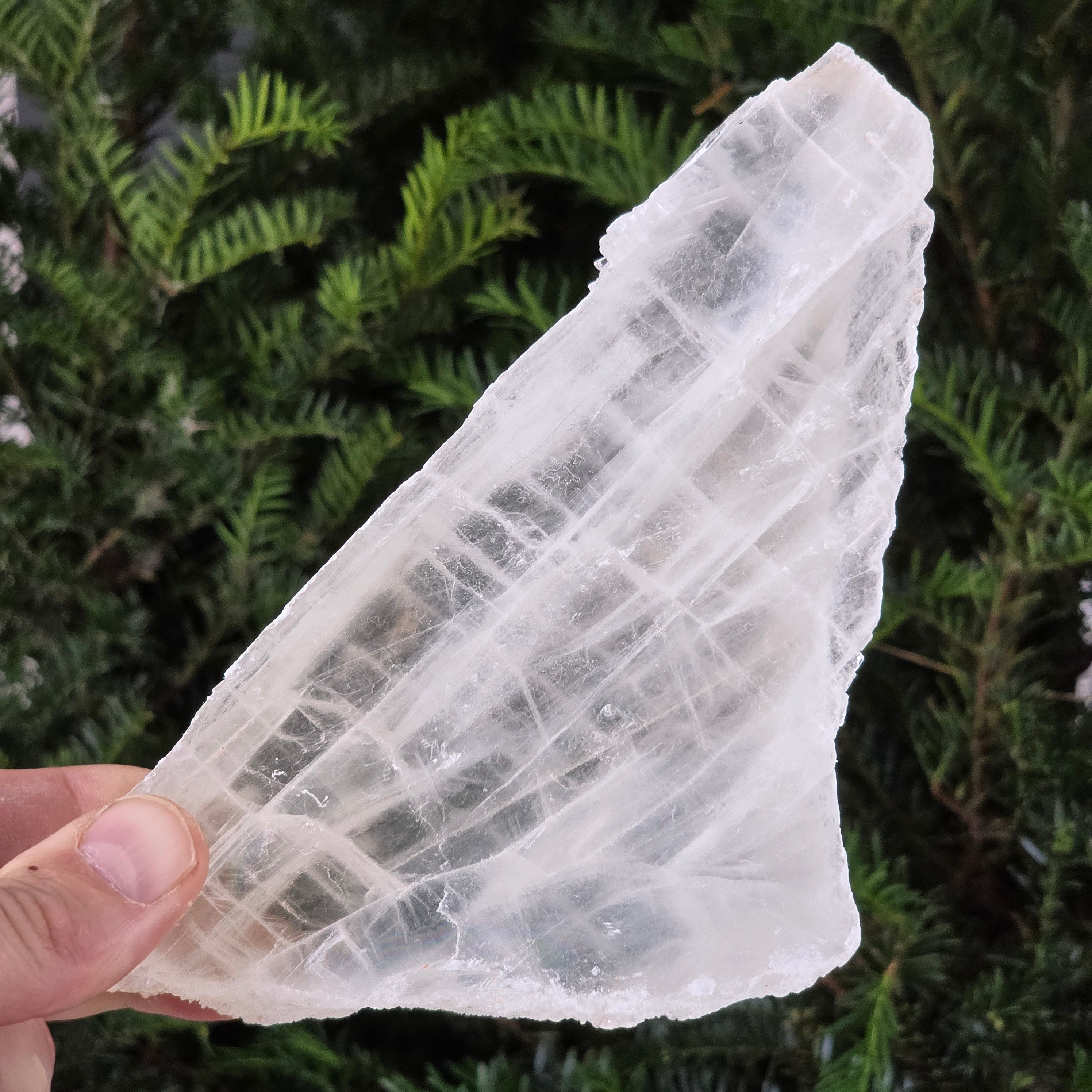 Această piatră brută de selenit sticlos pare desprinsă dintr-un fragment de lumină solidificată. Straturile sale translucide și reflexele diafane captează lumina într-un dans subtil, aducând senzația de puritate și pace.