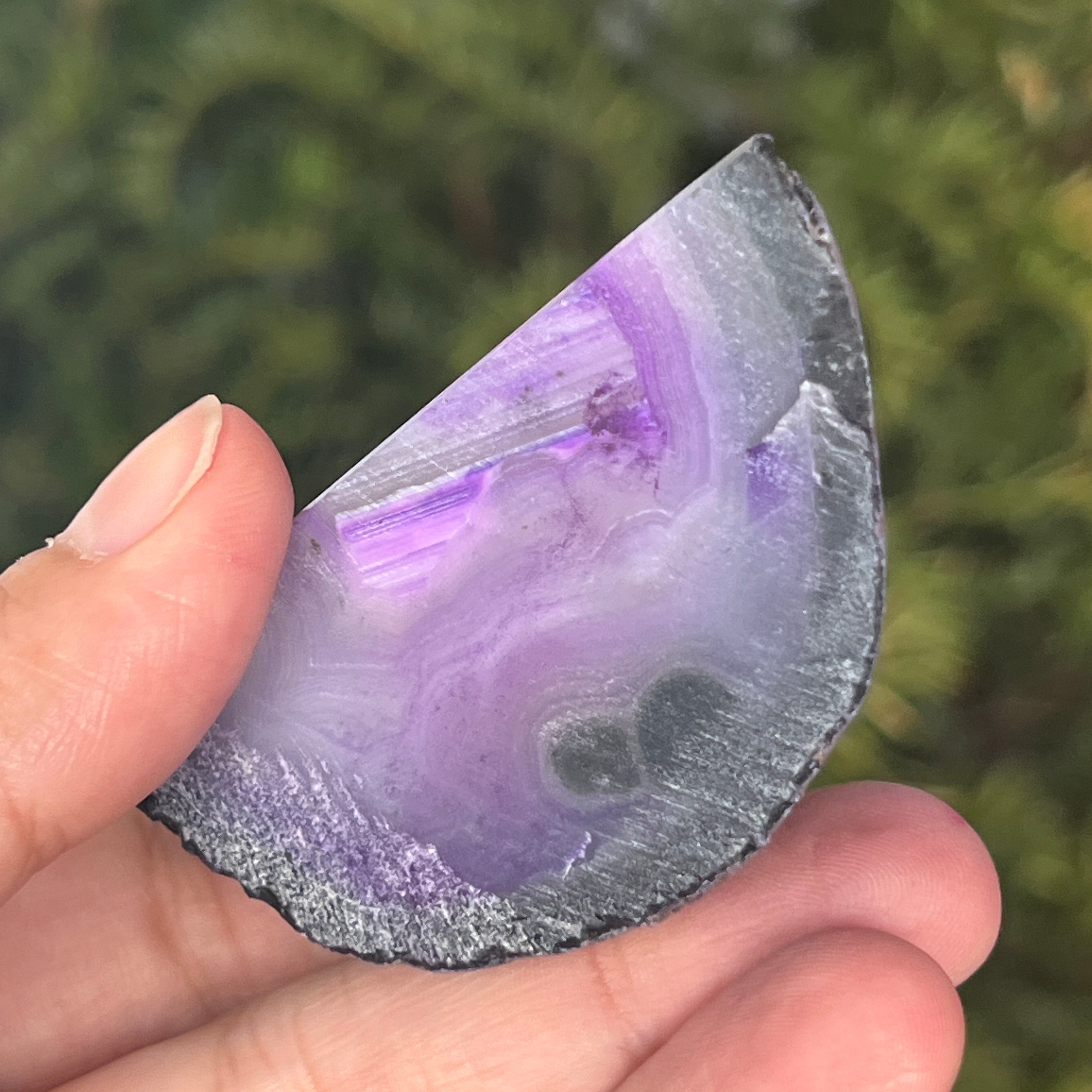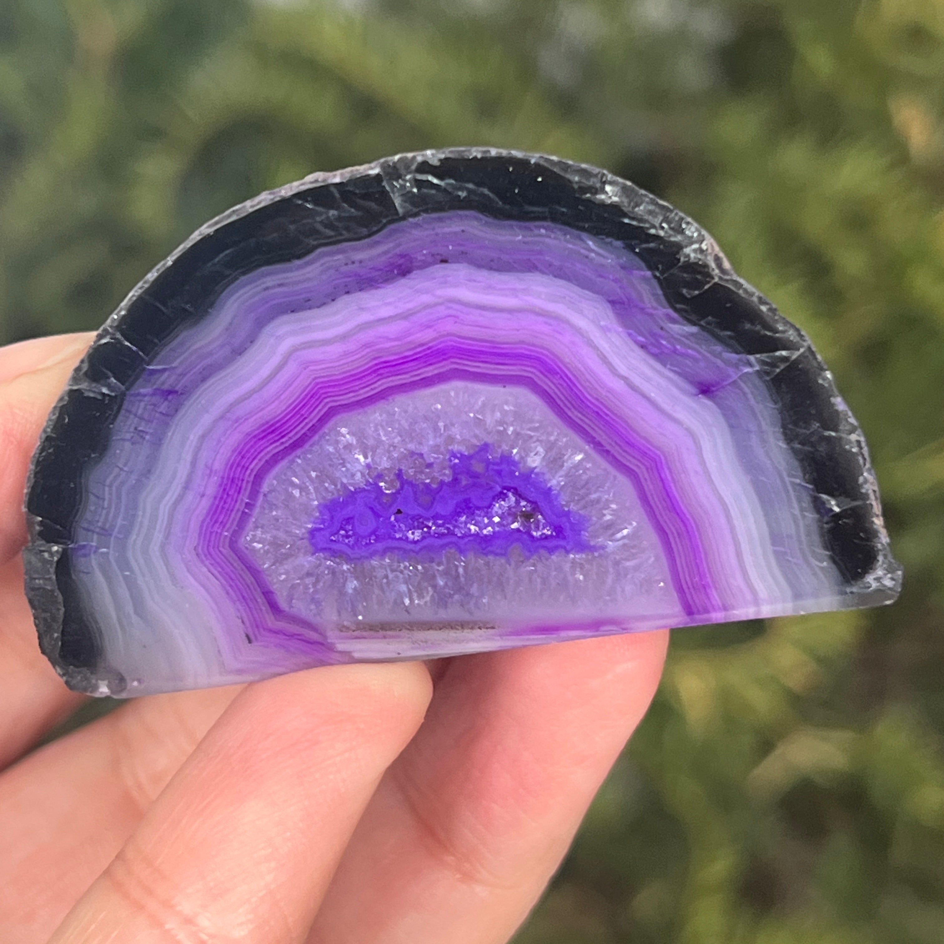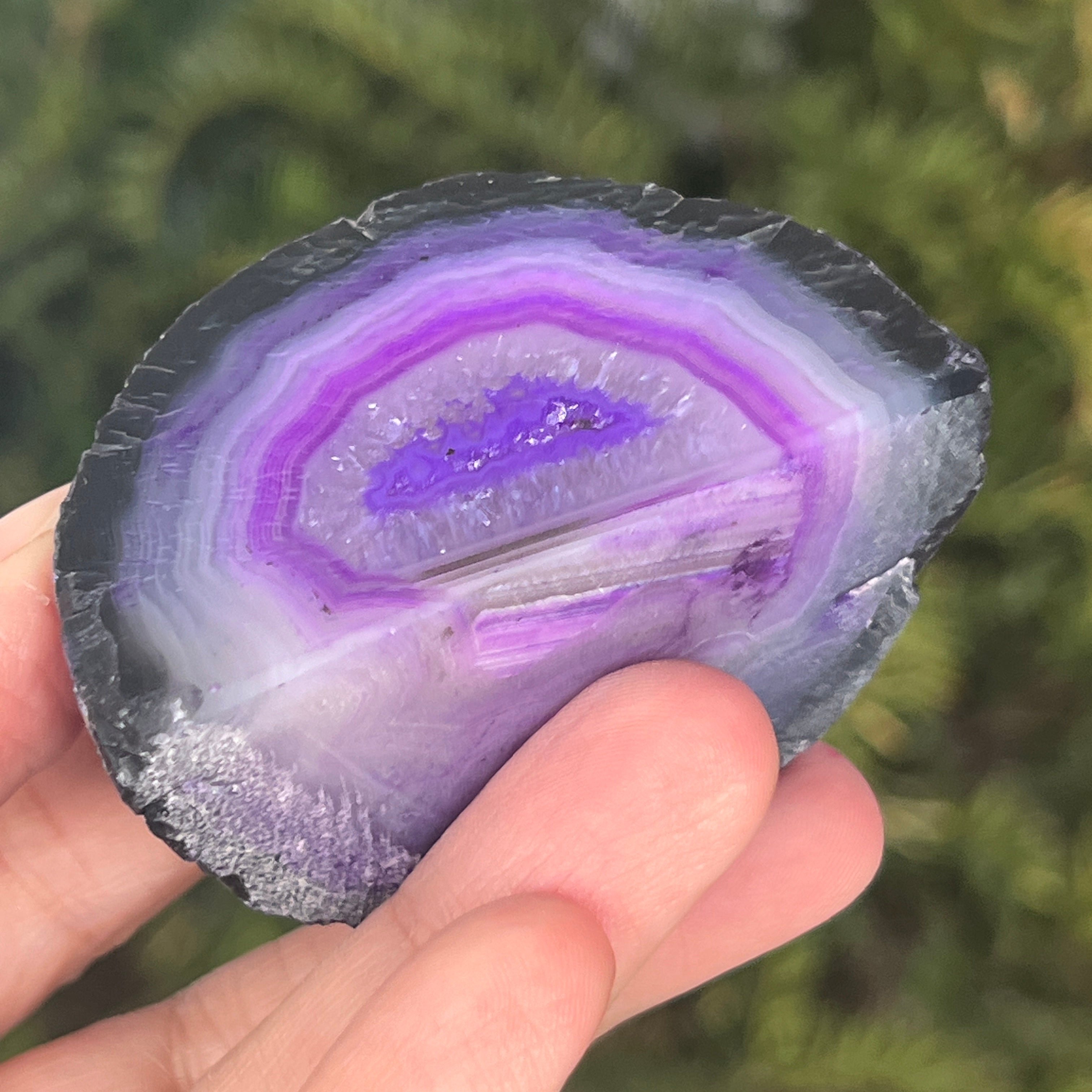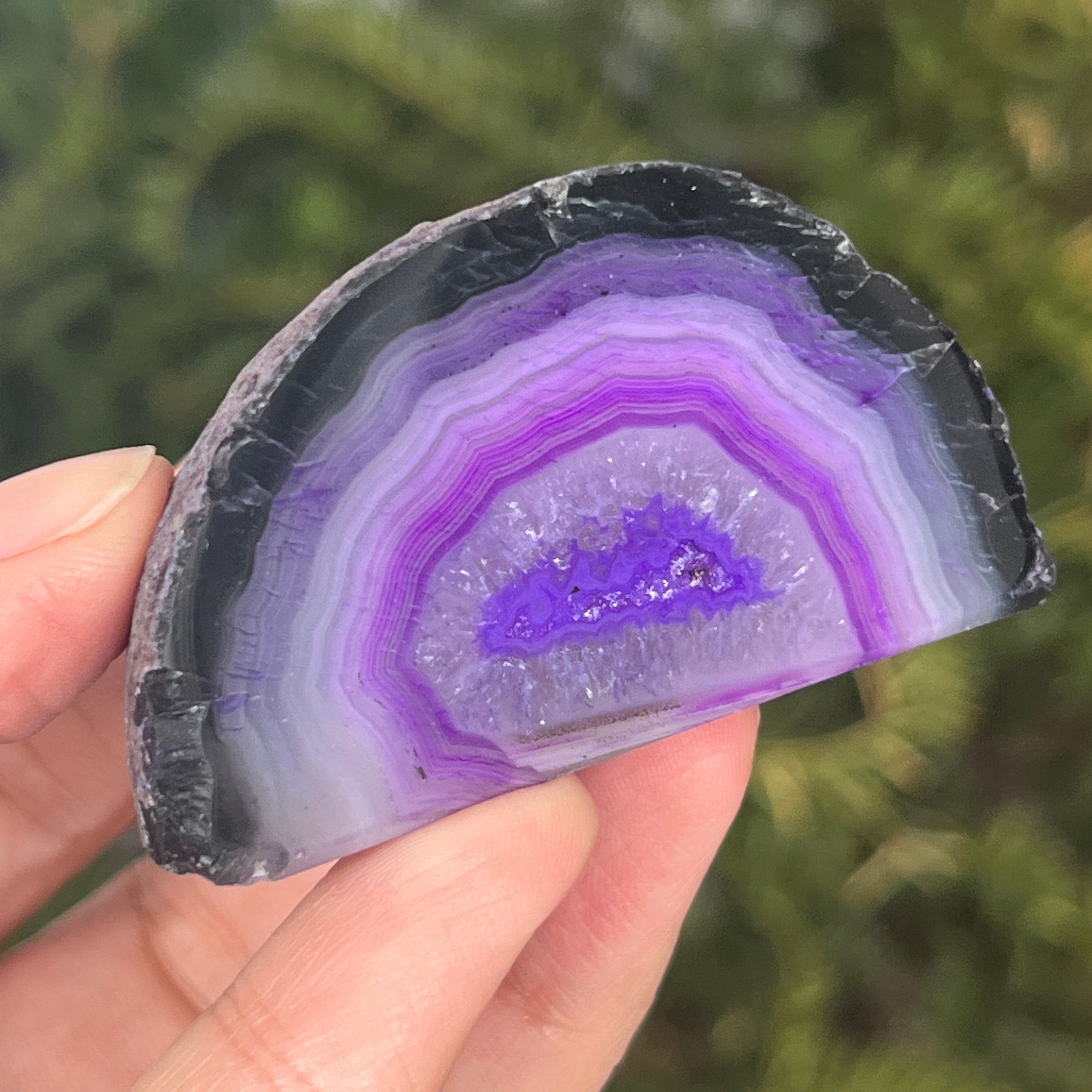 L'agate violette est une variété de calcédoine, une forme microcristalline de quartz caractérisée par sa structure stratifiée formée dans les cavités des roches volcaniques. La couleur violette met en valeur les bandes délicates du minéral et crée des contrastes spectaculaires. Elle est appréciée autant pour son esthétique particulière que pour sa symbolique liée au calme, à l'intuition et à la clarté mentale.
