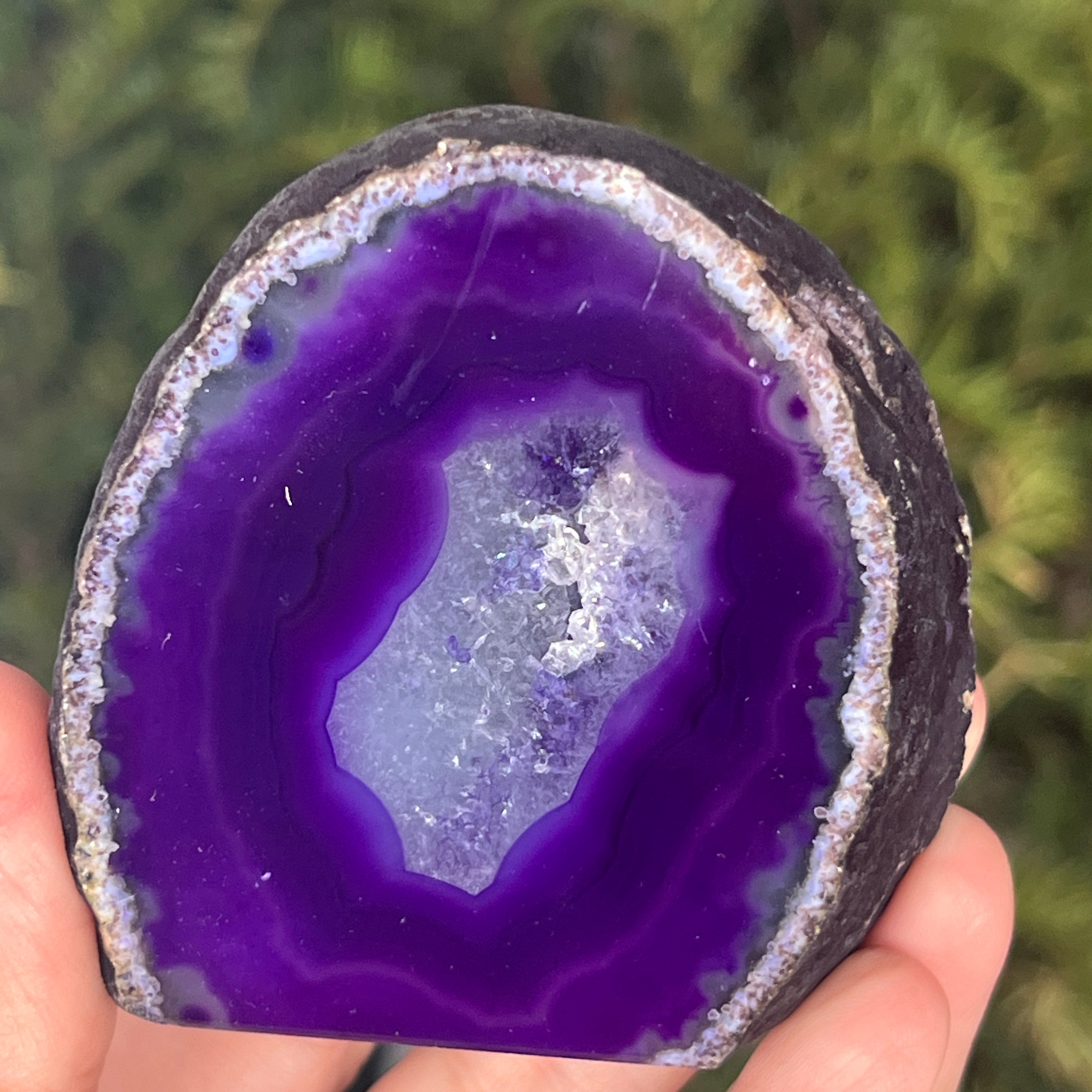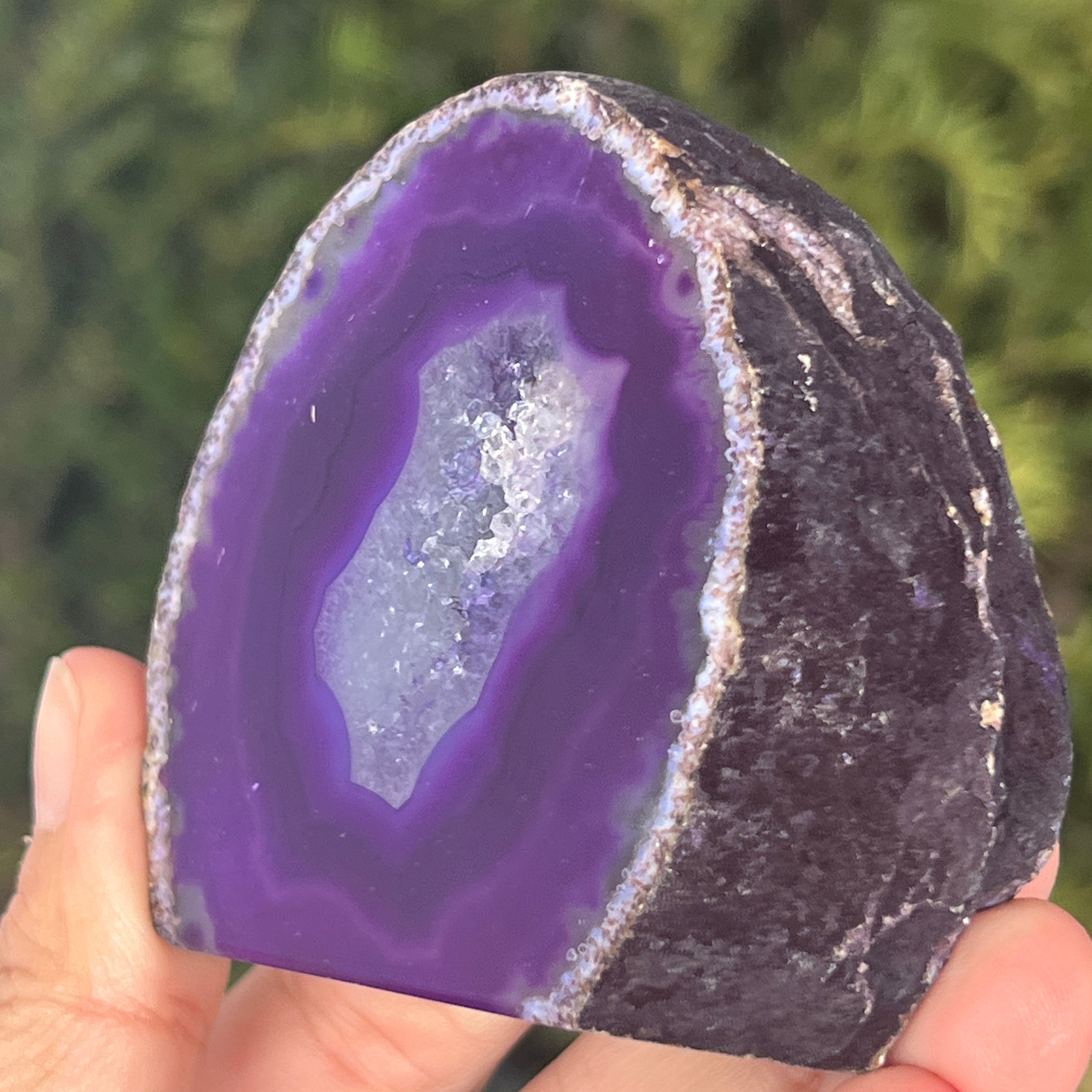 L'agate violette est une variété de calcédoine, une forme microcristalline de quartz caractérisée par sa structure stratifiée formée dans les cavités des roches volcaniques. La couleur violette met en valeur les bandes délicates du minéral et crée des contrastes spectaculaires. Elle est appréciée autant pour son esthétique particulière que pour sa symbolique liée au calme, à l'intuition et à la clarté mentale.