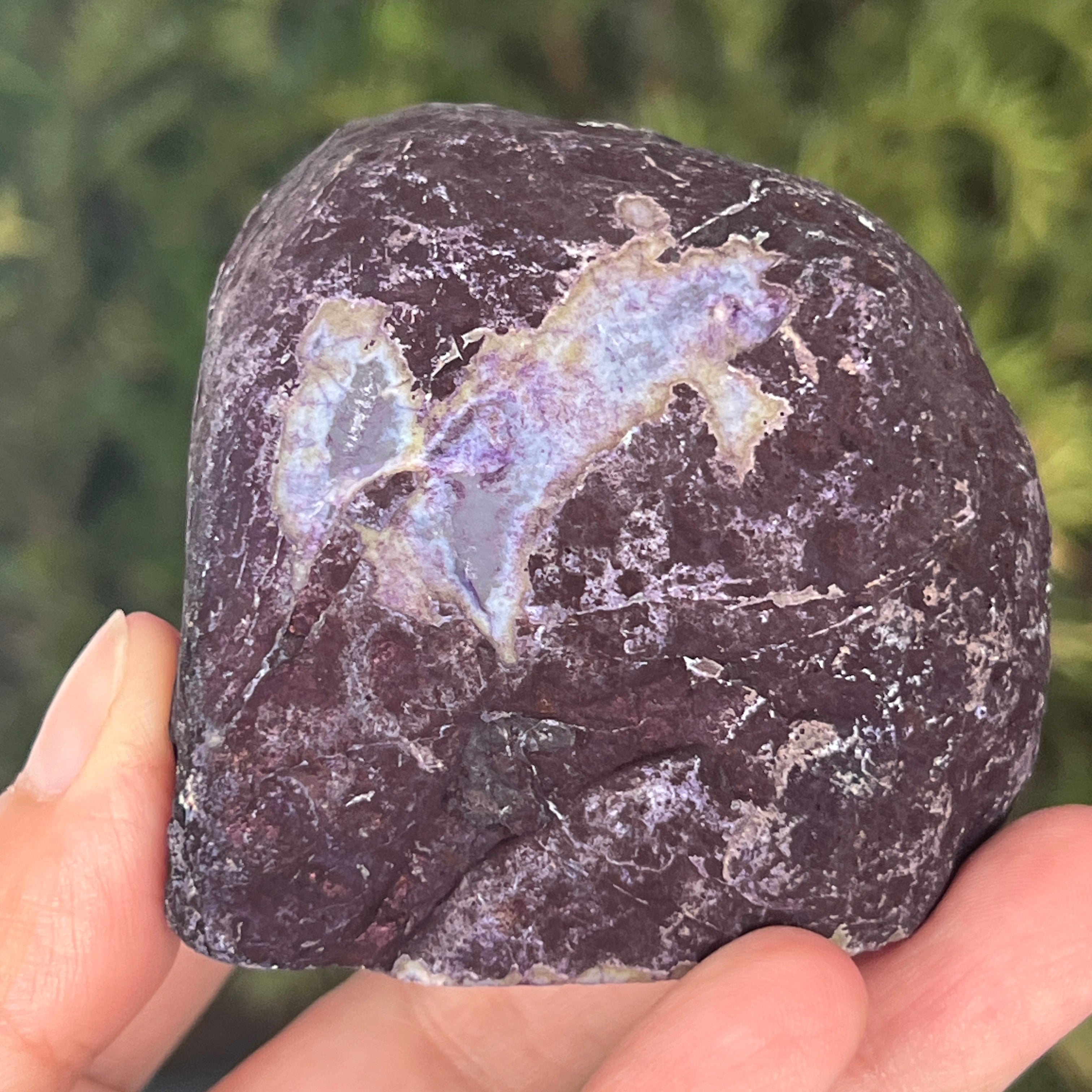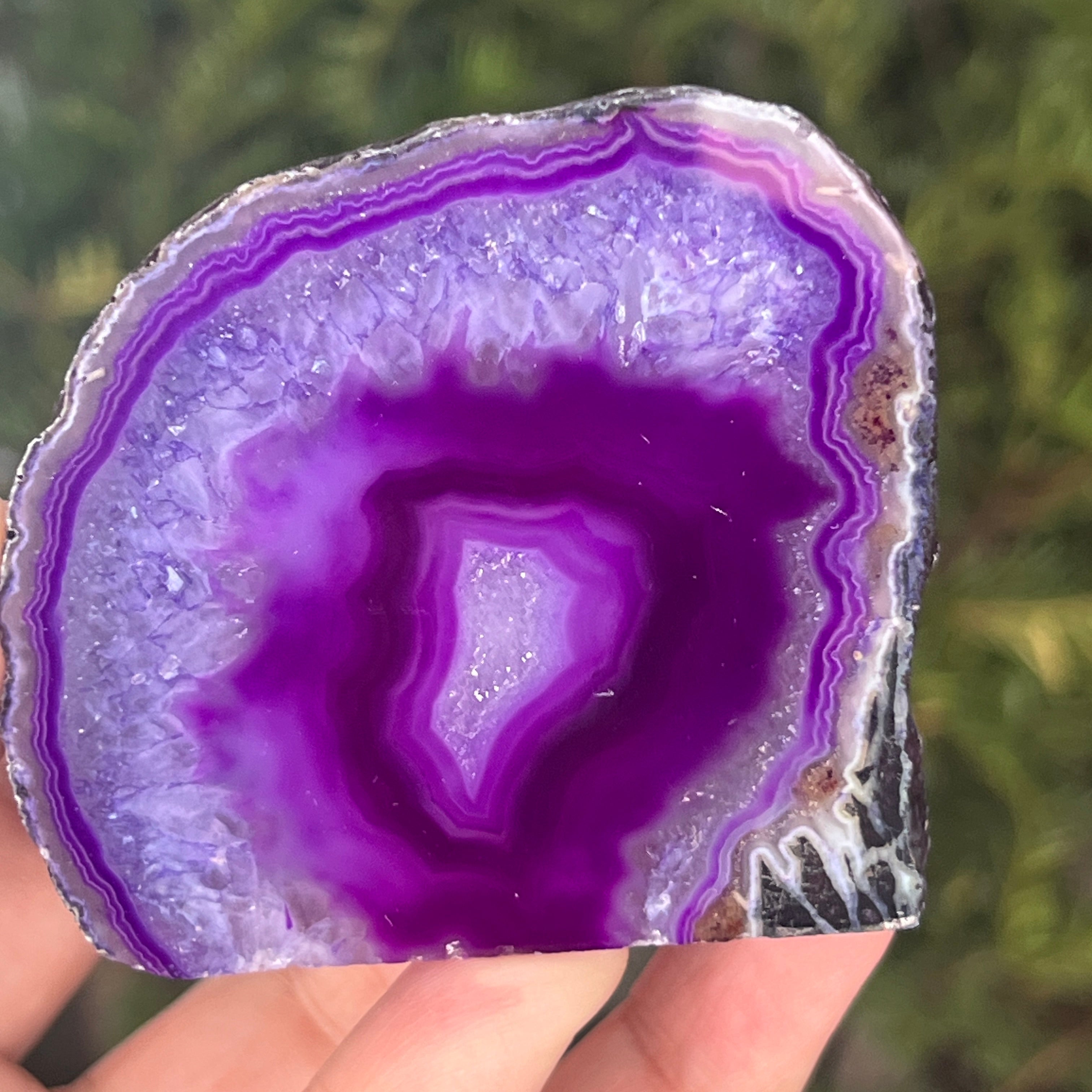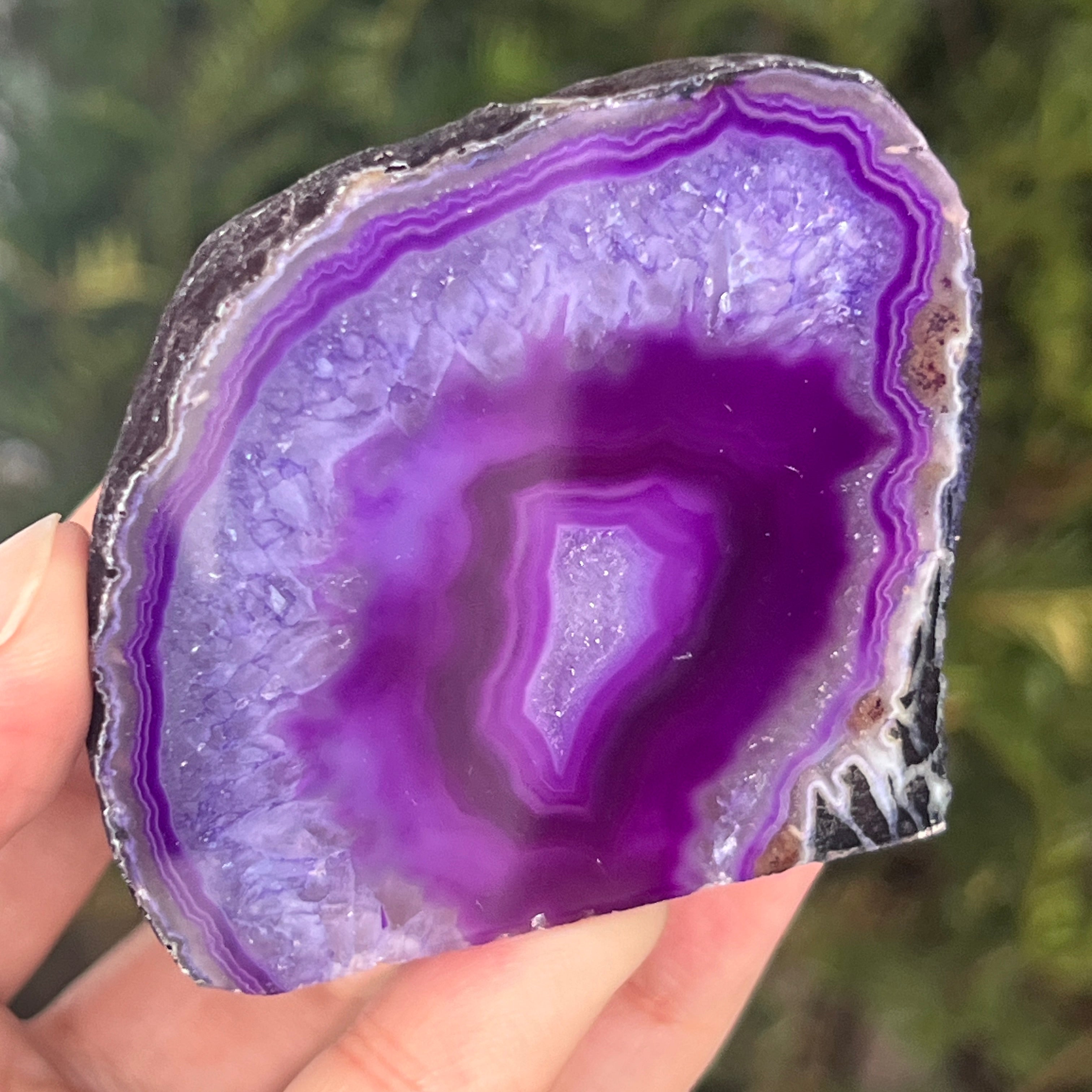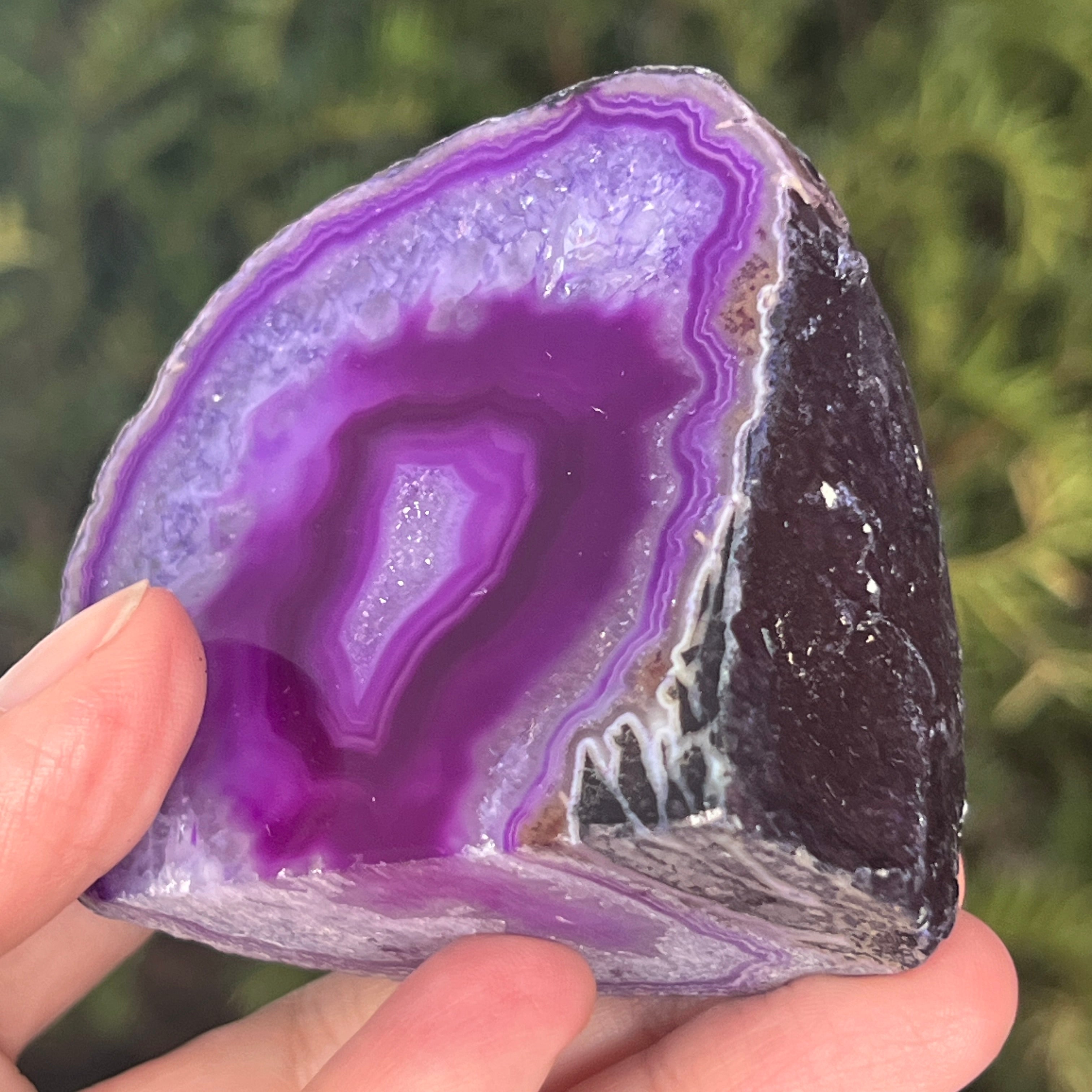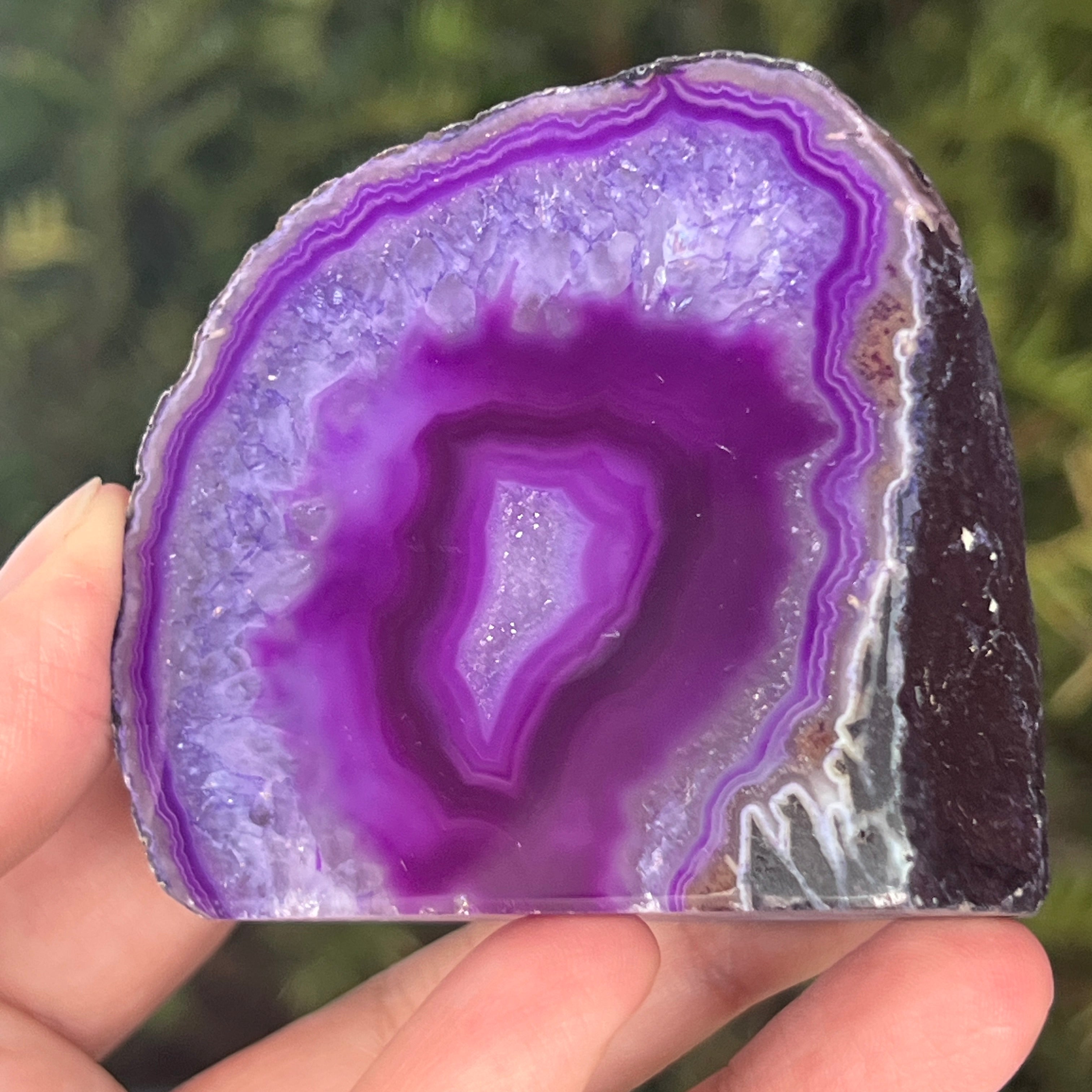 L'agate violette est une variété de calcédoine, une forme microcristalline de quartz caractérisée par sa structure stratifiée formée dans les cavités des roches volcaniques. La couleur violette met en valeur les bandes délicates du minéral et crée des contrastes spectaculaires. Elle est appréciée tant pour son esthétique particulière que pour sa symbolique liée au calme, à l'intuition et à la clarté mentale.