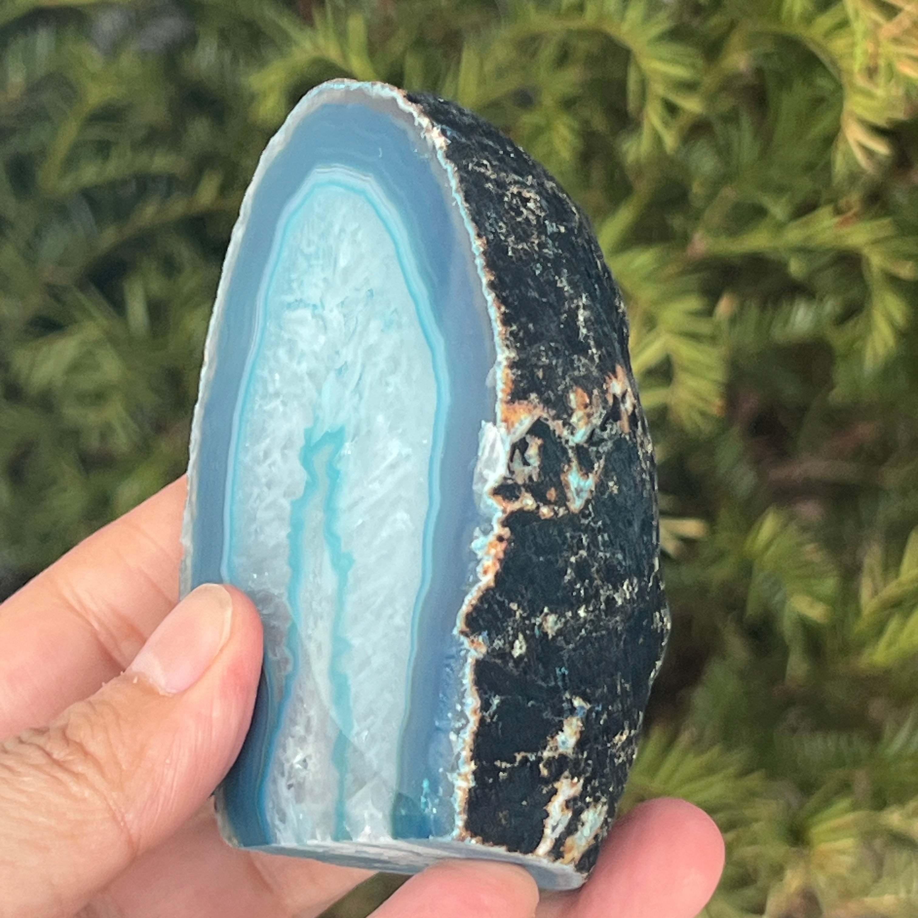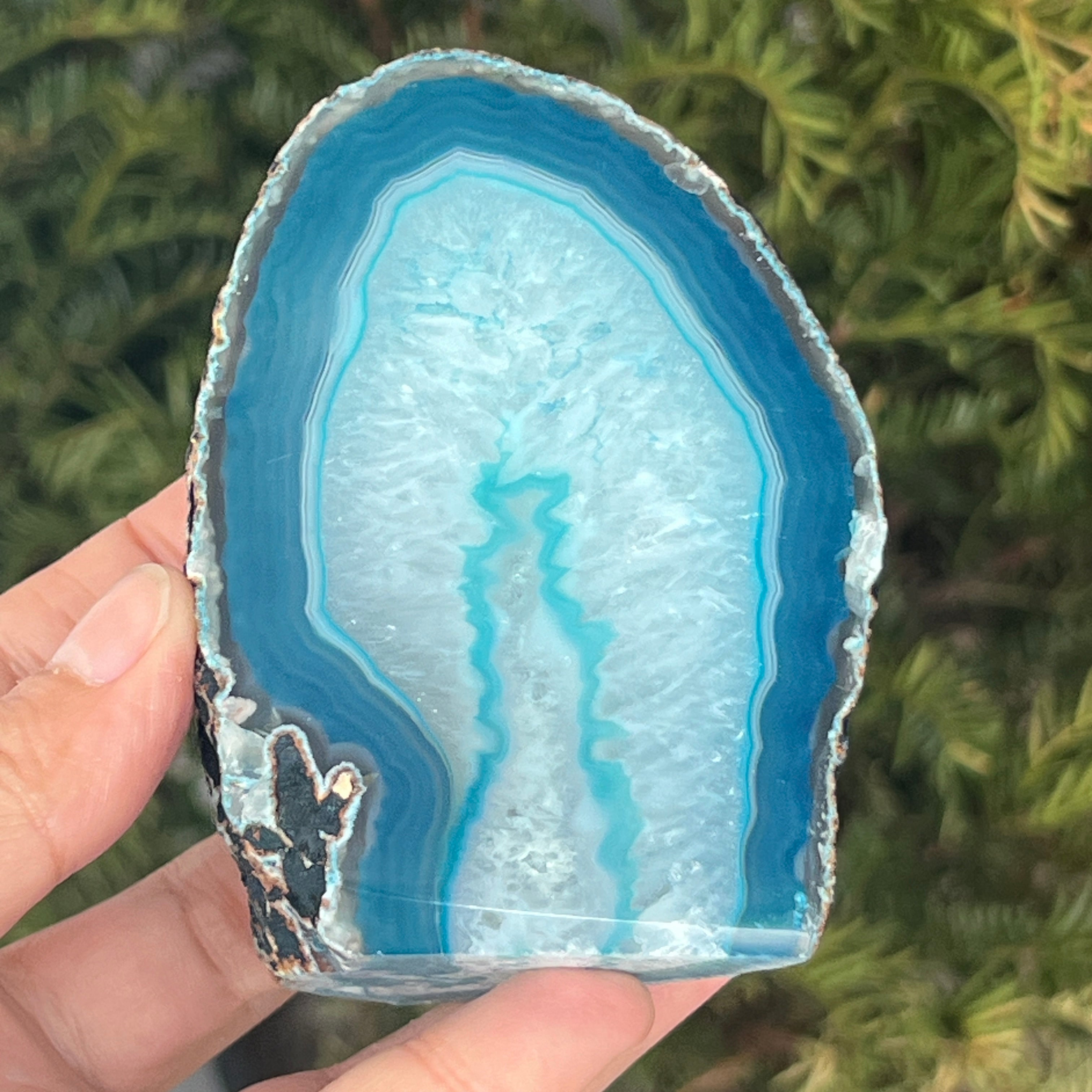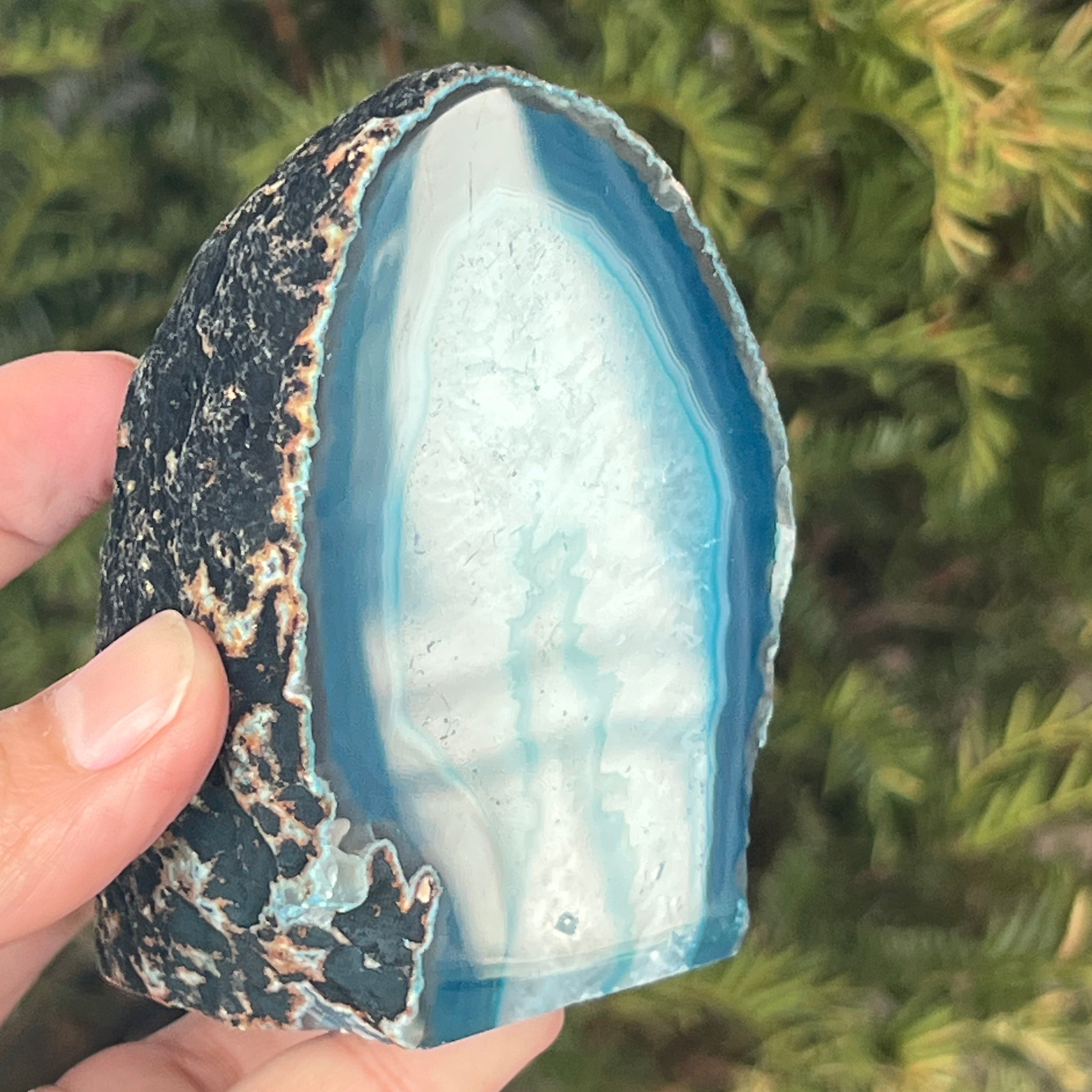 L'agate vert-bleu est une variété de calcédoine à structure stratifiée, formée par des dépôts successifs de silice dans des cavités géologiques. Ses tonalités entre le vert et le bleu mettent en valeur les bandes naturelles caractéristiques de l'agate. Elle est appréciée pour l'harmonie de ses couleurs et pour la symbolique associée à l'équilibre intérieur et à la sérénité émotionnelle.