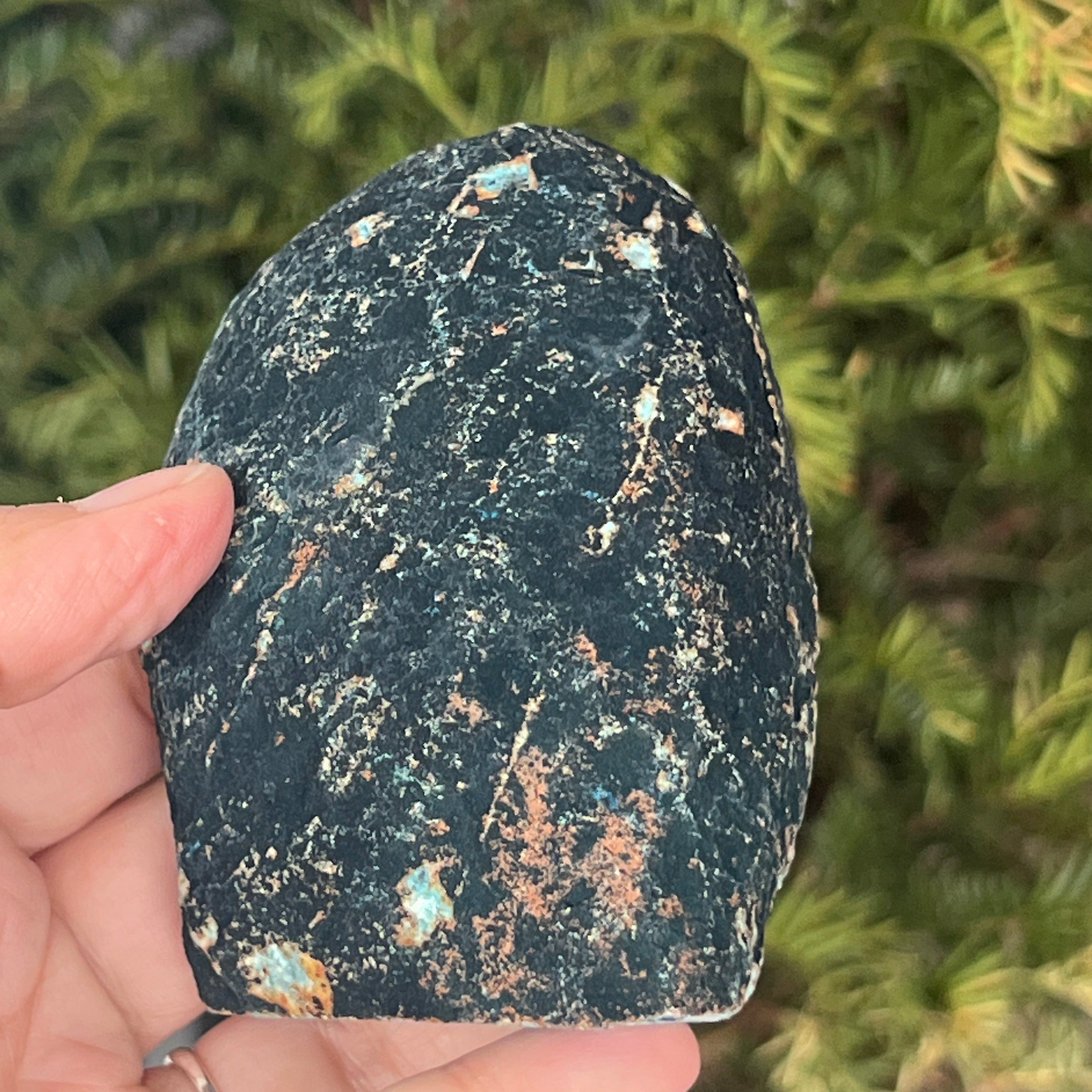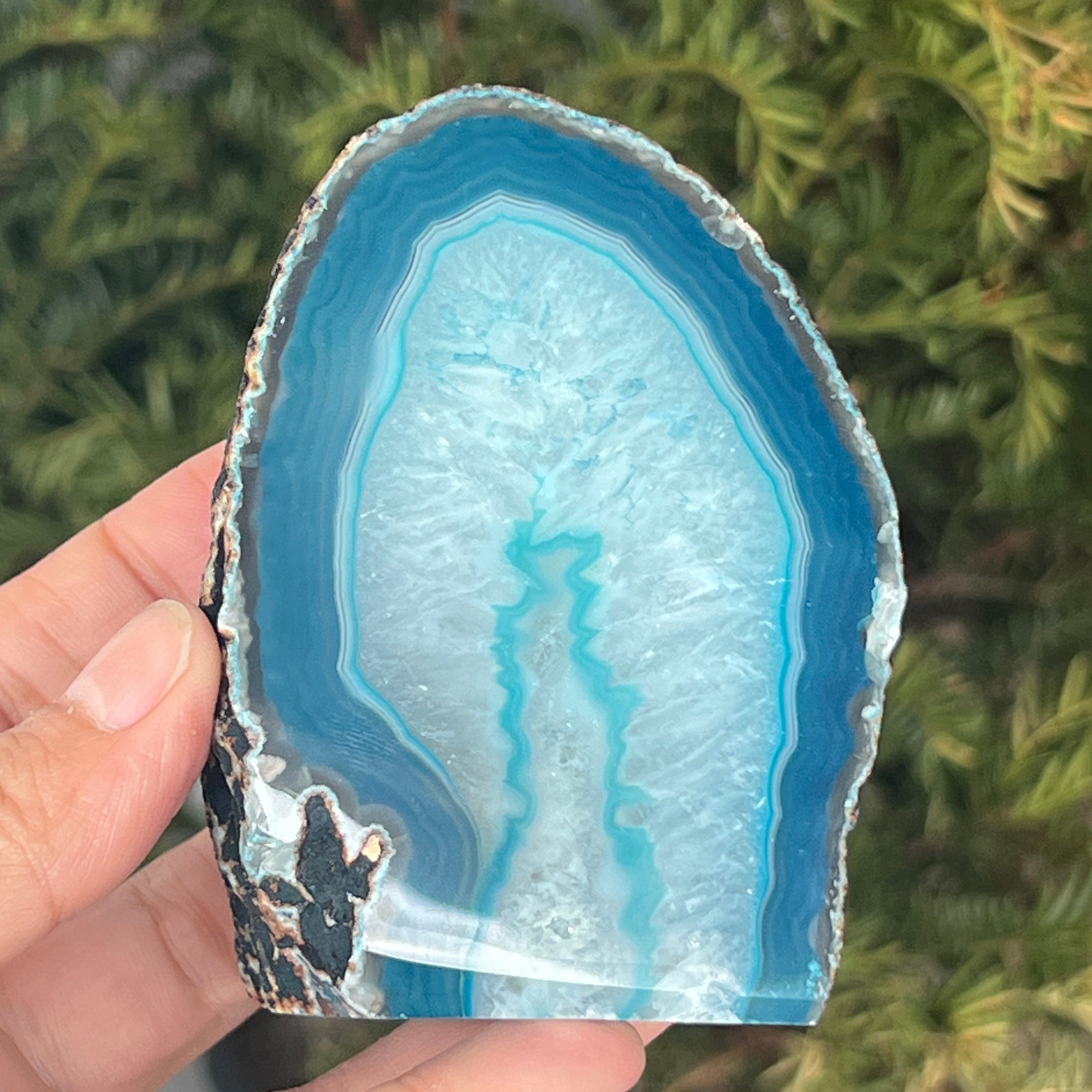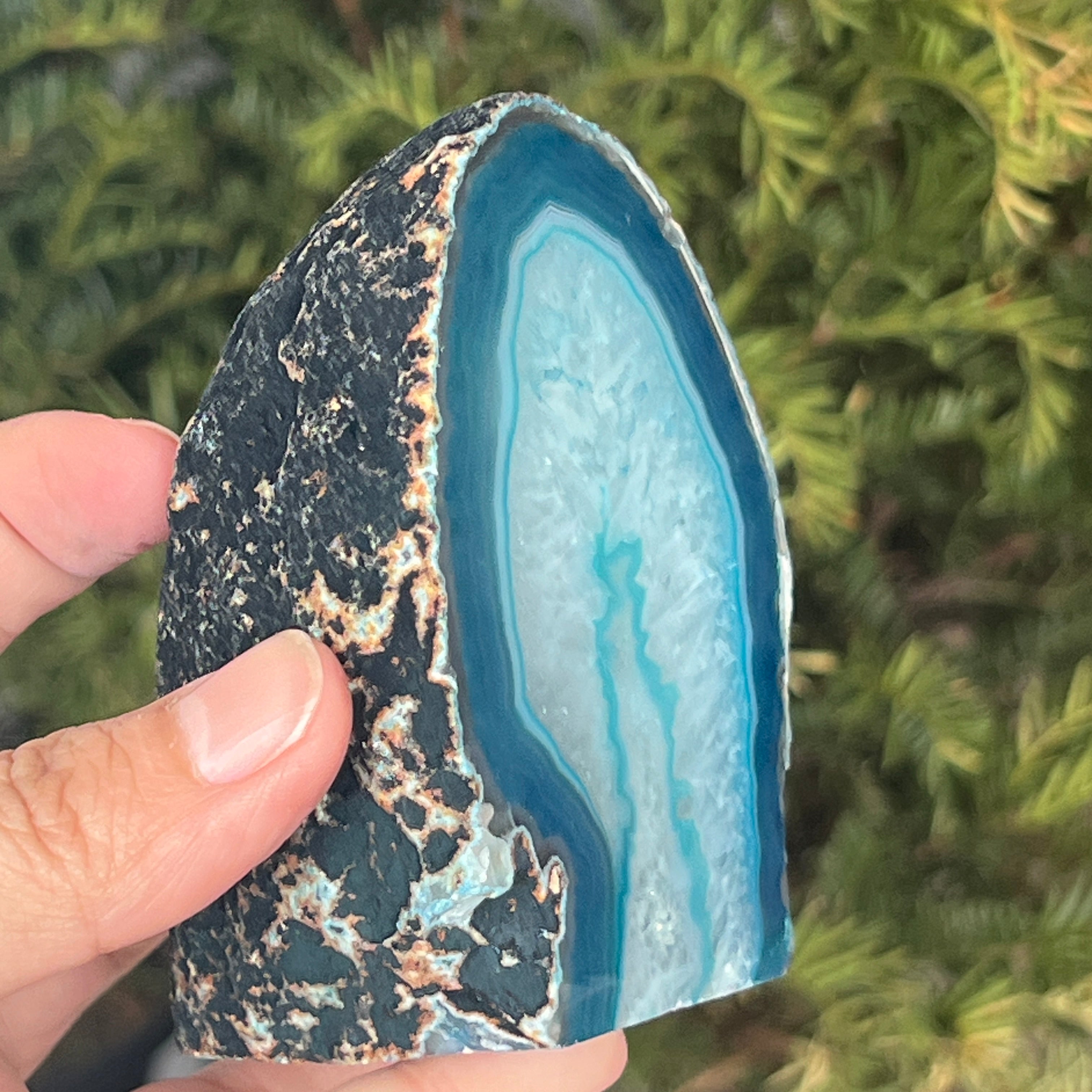 L'agate vert-bleu est une variété de calcédoine à structure stratifiée, formée par des dépôts successifs de silice dans des cavités géologiques. Ses tonalités entre le vert et le bleu mettent en valeur les bandes naturelles caractéristiques de l'agate. Elle est appréciée pour l'harmonie de ses couleurs et pour la symbolique associée à l'équilibre intérieur et à la sérénité émotionnelle.