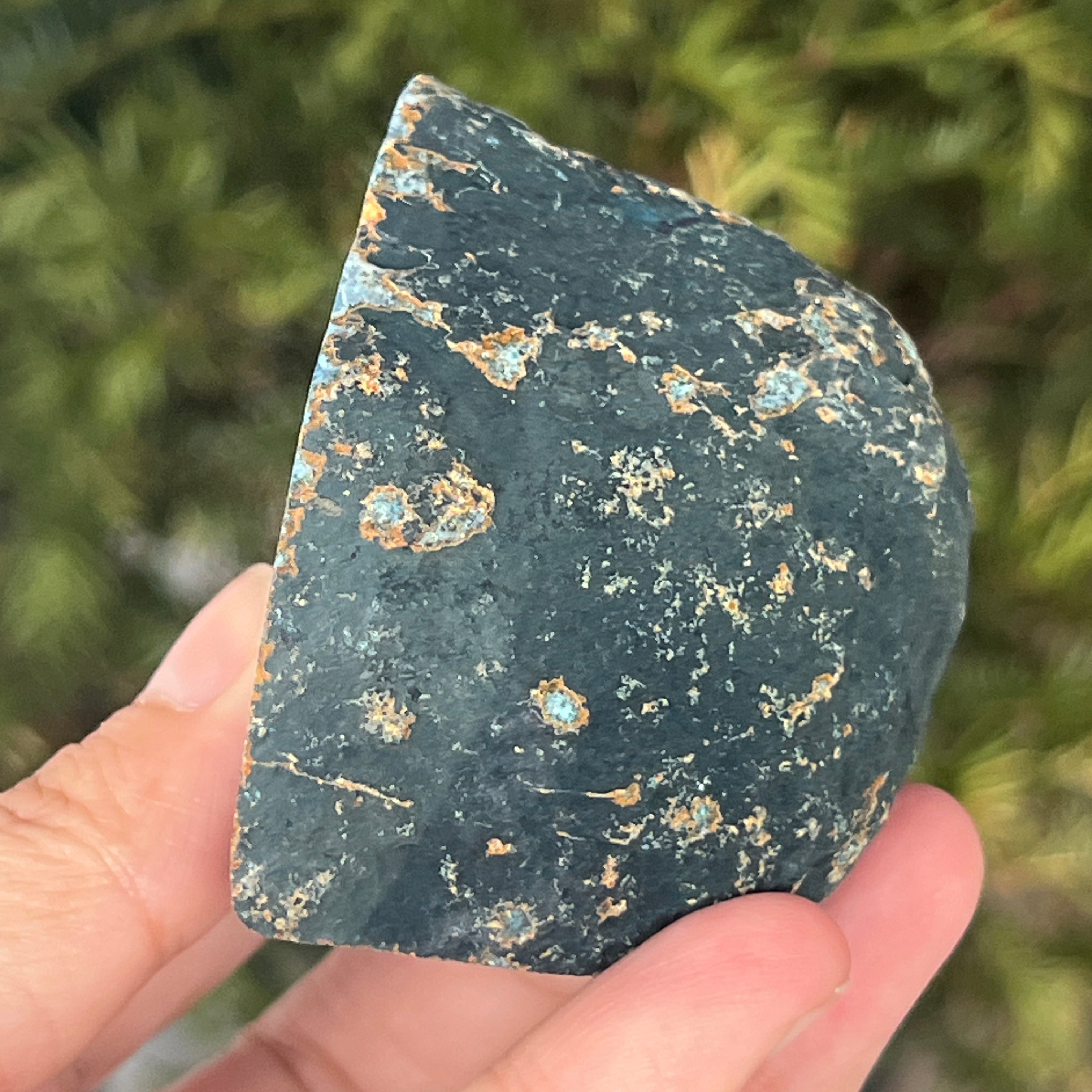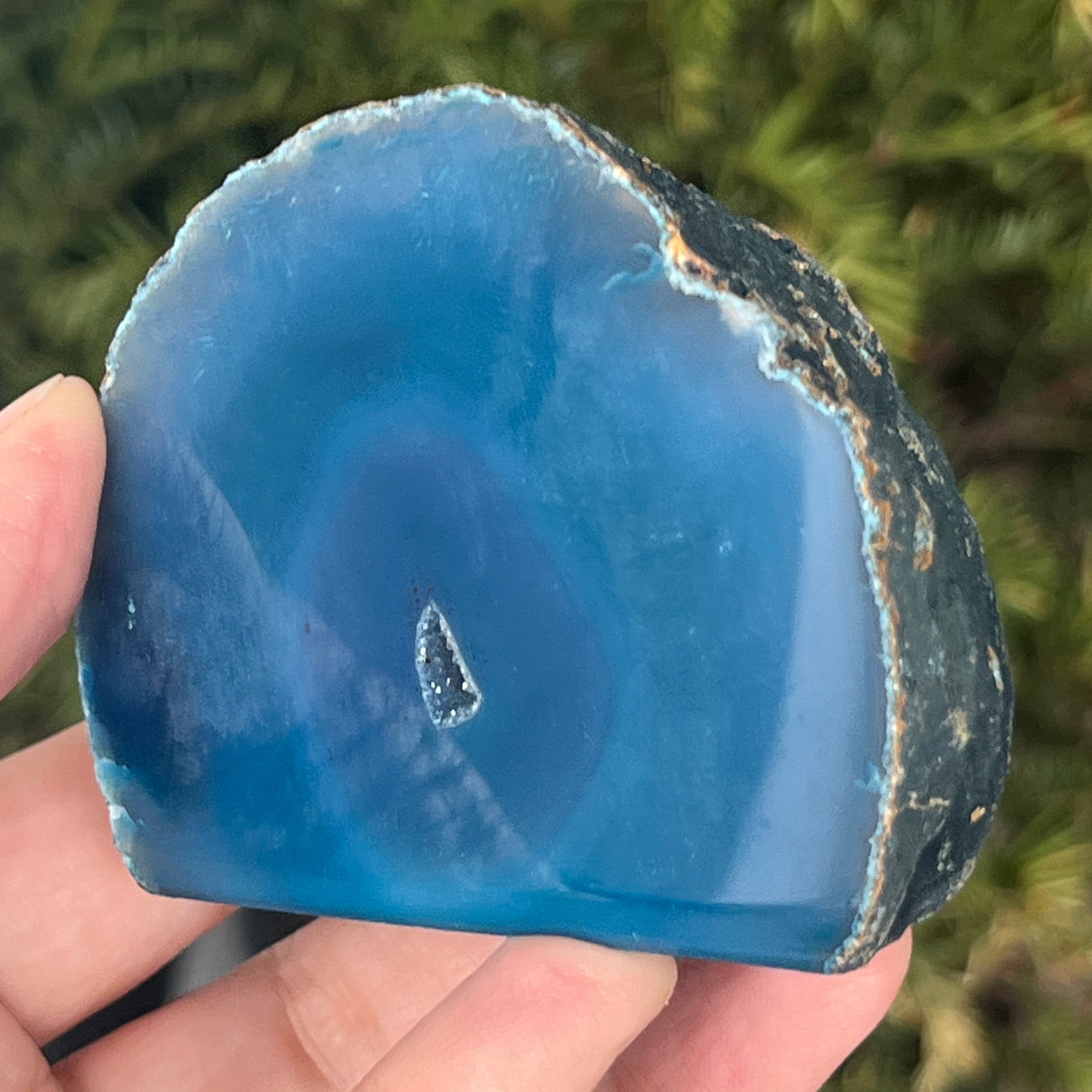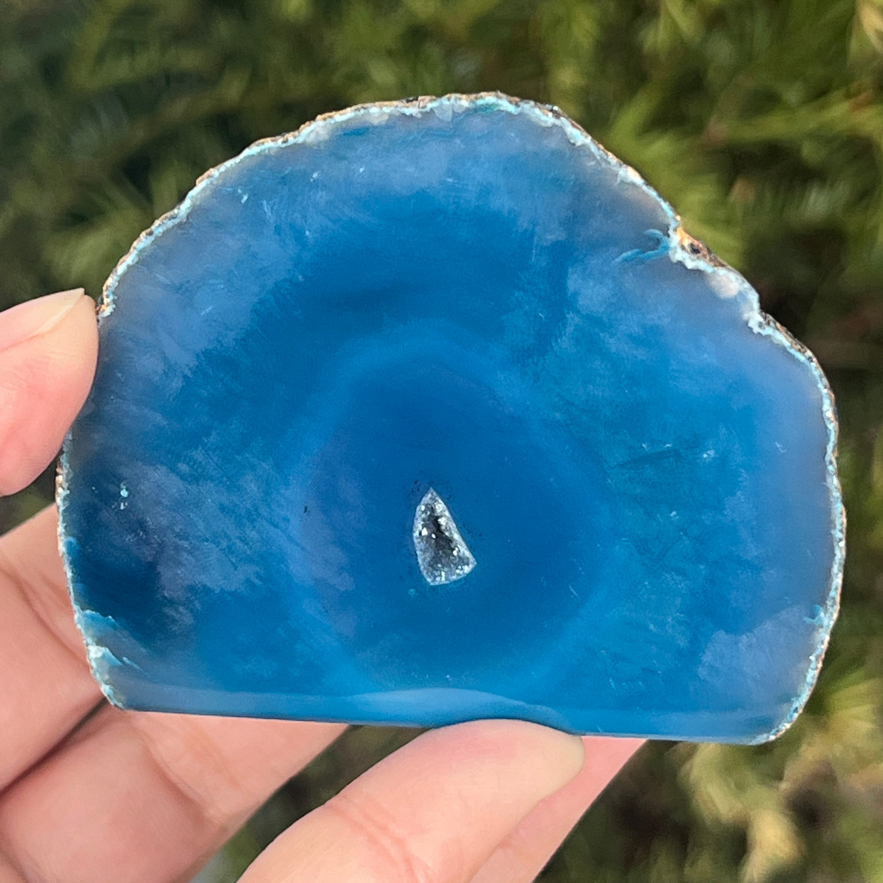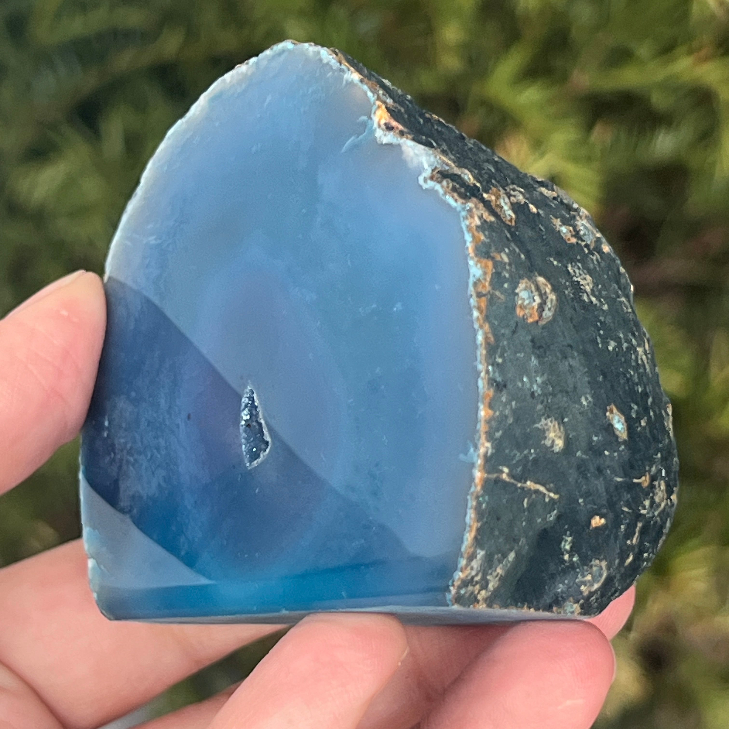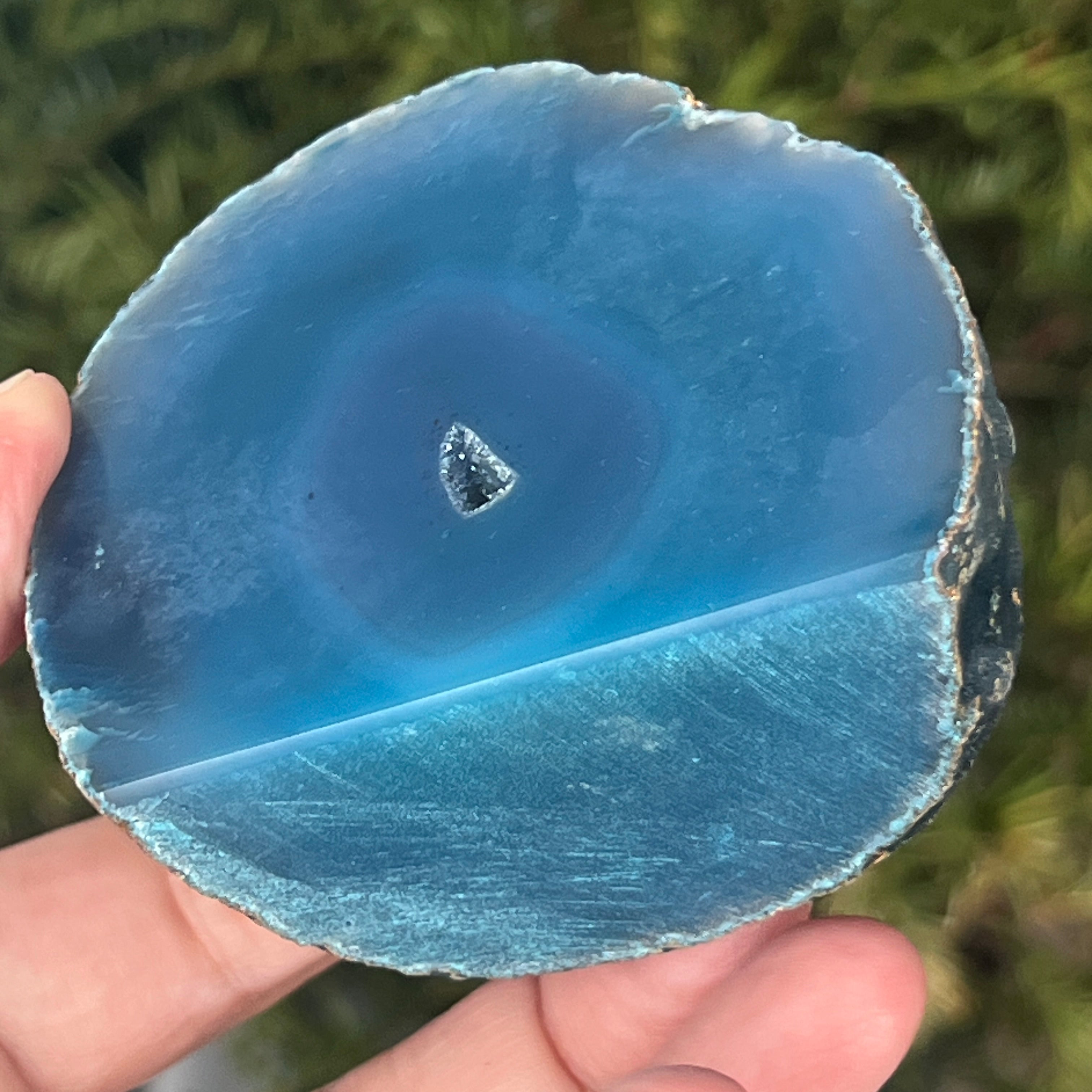 L'agate vert-bleu est une variété de calcédoine à structure stratifiée, formée par des dépôts successifs de silice dans des cavités géologiques. Ses tonalités entre le vert et le bleu mettent en valeur les bandes naturelles caractéristiques de l'agate. Elle est appréciée pour l'harmonie de ses couleurs et pour la symbolique associée à l'équilibre intérieur et à la sérénité émotionnelle.