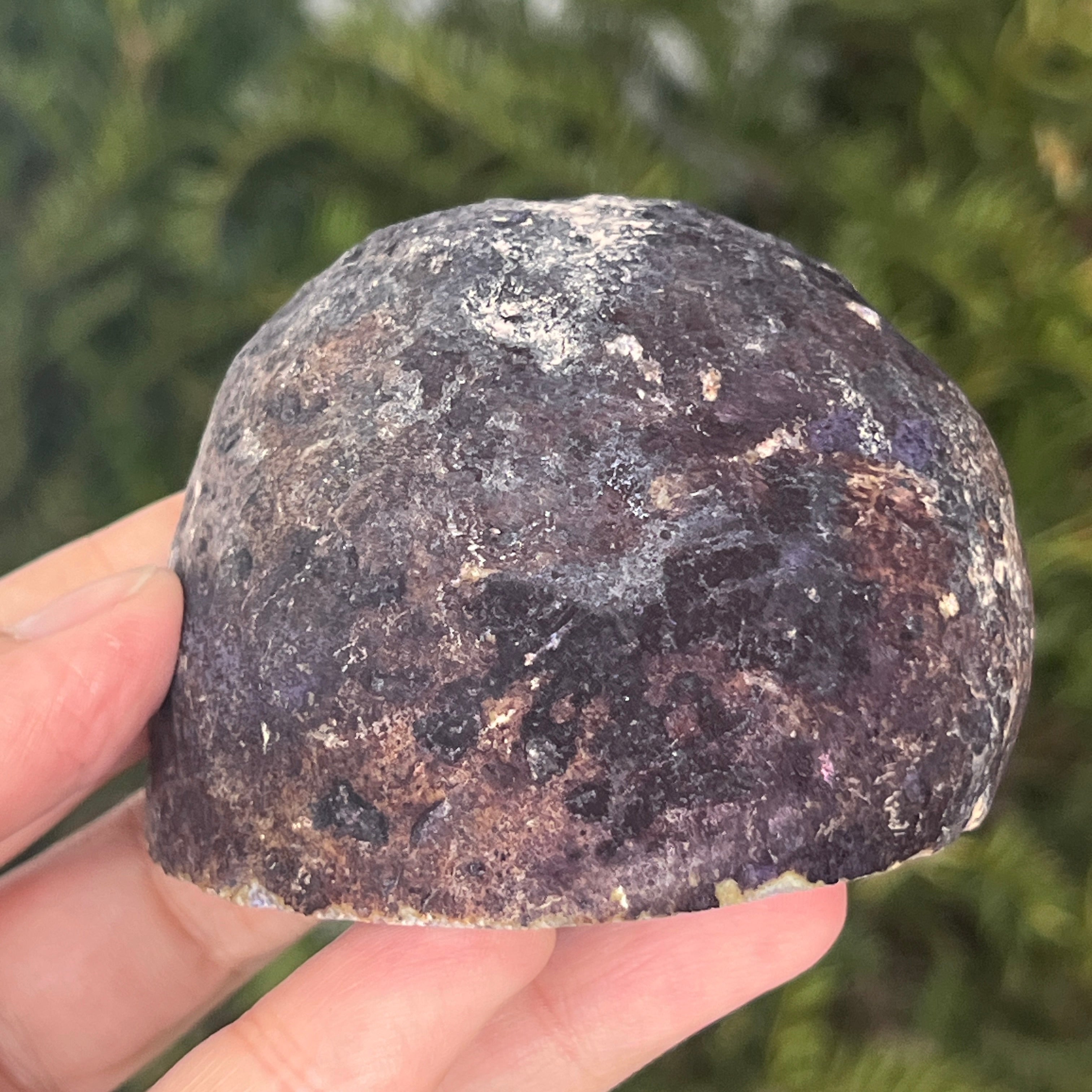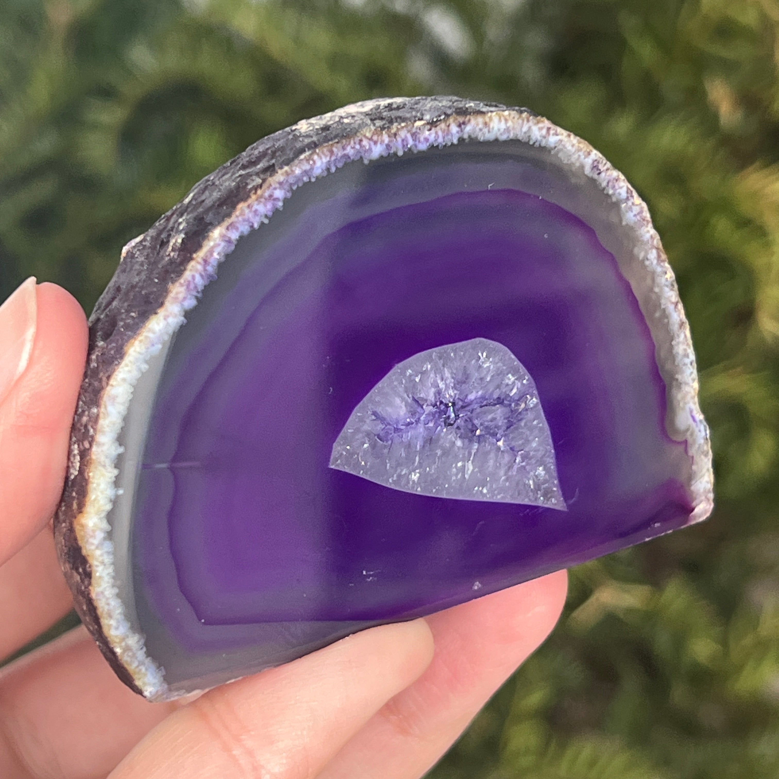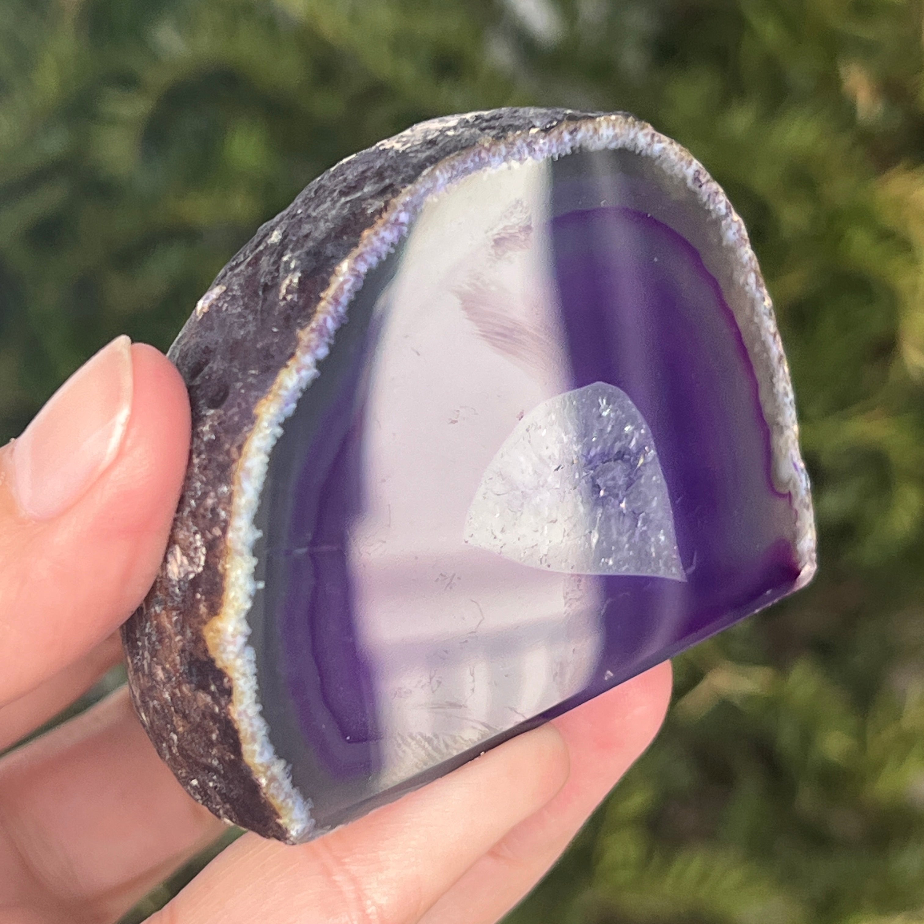 L’agate violette est une variété de calcédoine, une forme microcristalline de quartz caractérisée par sa structure stratifiée formée dans les cavités des roches volcaniques. La couleur violette met en valeur les bandes délicates du minéral et crée des contrastes spectaculaires. Elle est appréciée tant pour son esthétique particulière que pour sa symbolique liée au calme, à l’intuition et à la clarté mentale.