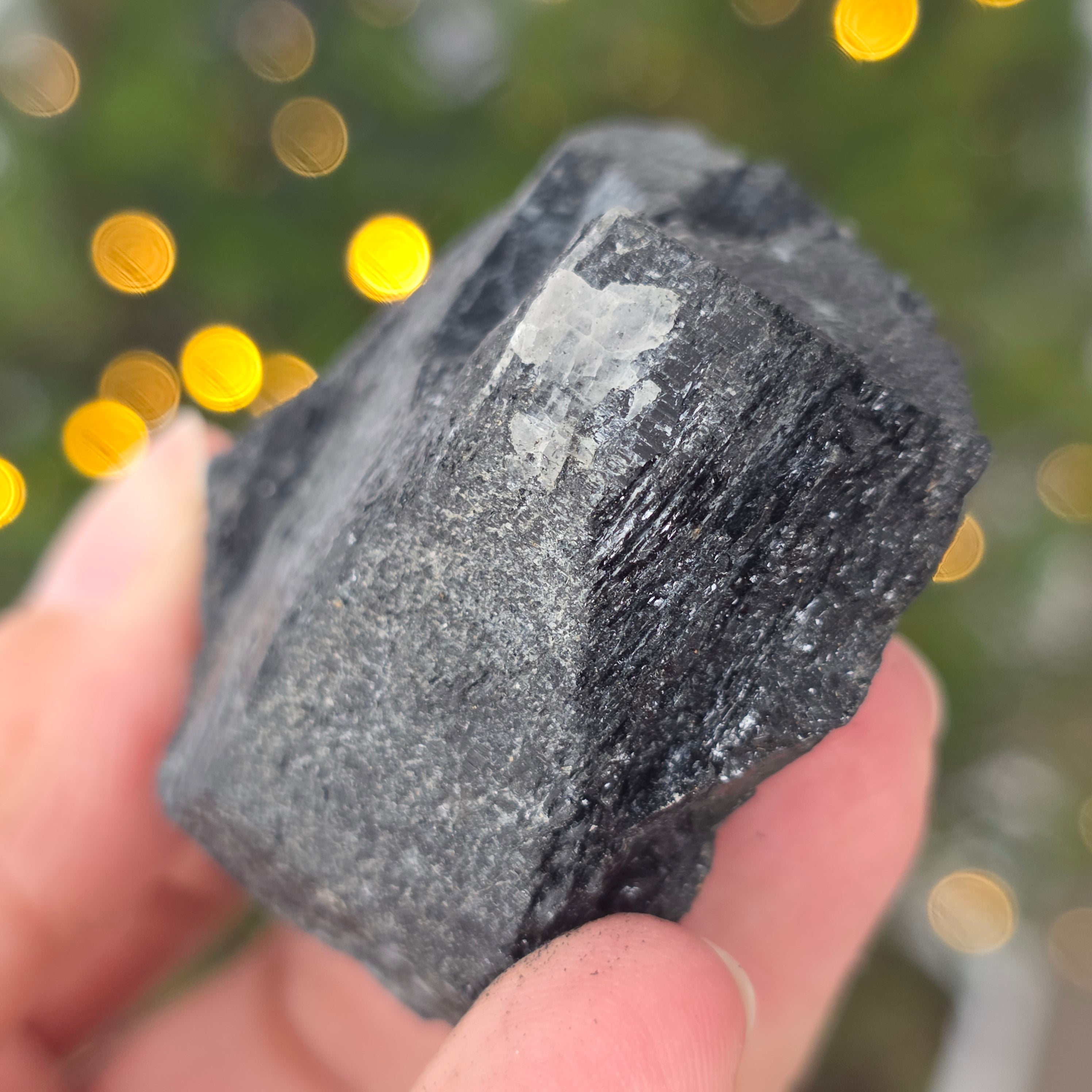 La tourmaline noire, également connue sous le nom de schorl, est constituée d'un mélange complexe de borosilicates et se présente sous diverses formes cristallines. C'est un minéral très dur et doté d'une grande résistance aux rayures et à l'usure.
