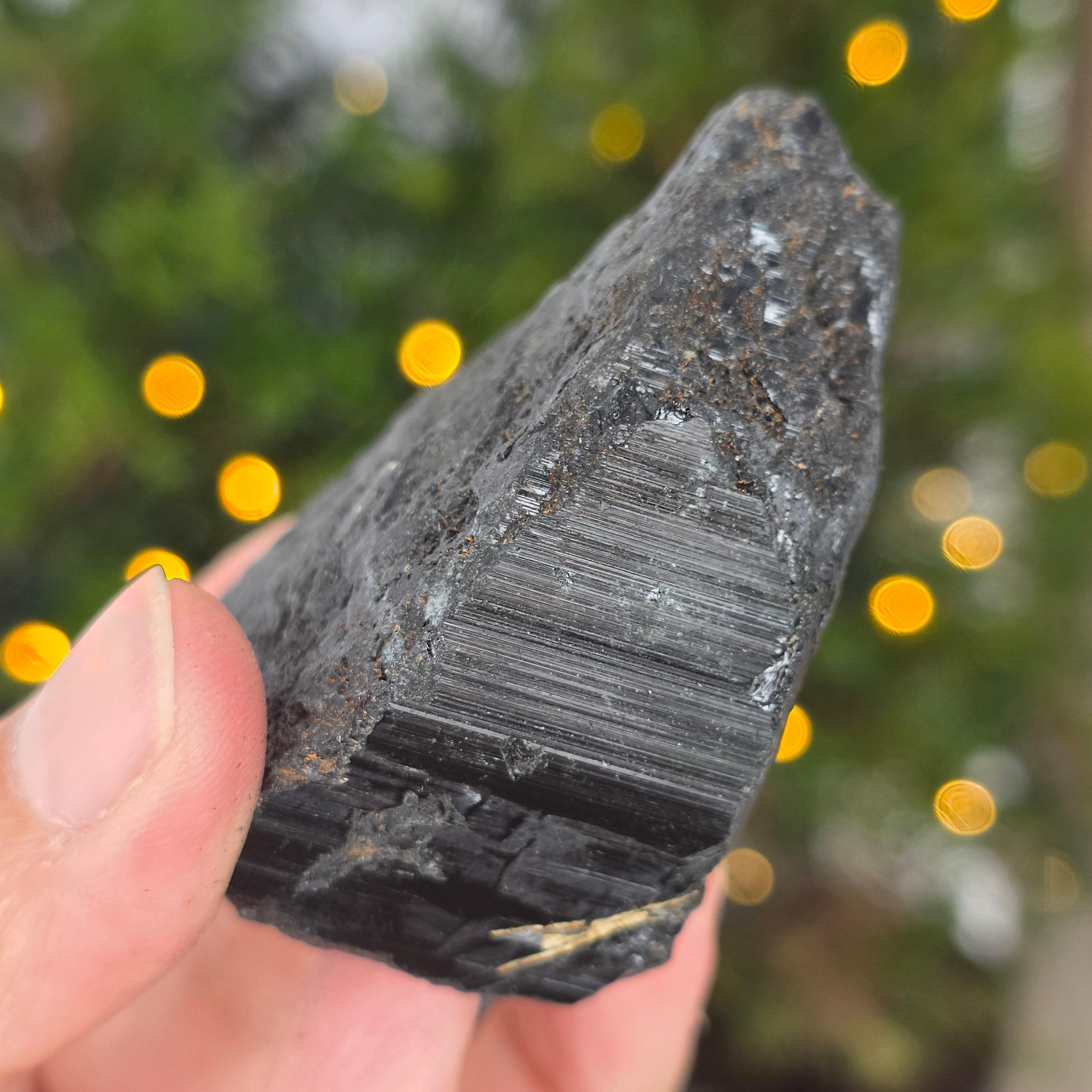 La tourmaline noire, également connue sous le nom de schorl, est constituée d'un mélange complexe de borosilicates et se présente sous diverses formes cristallines. C'est un minéral très dur et doté d'une grande résistance aux rayures et à l'usure.