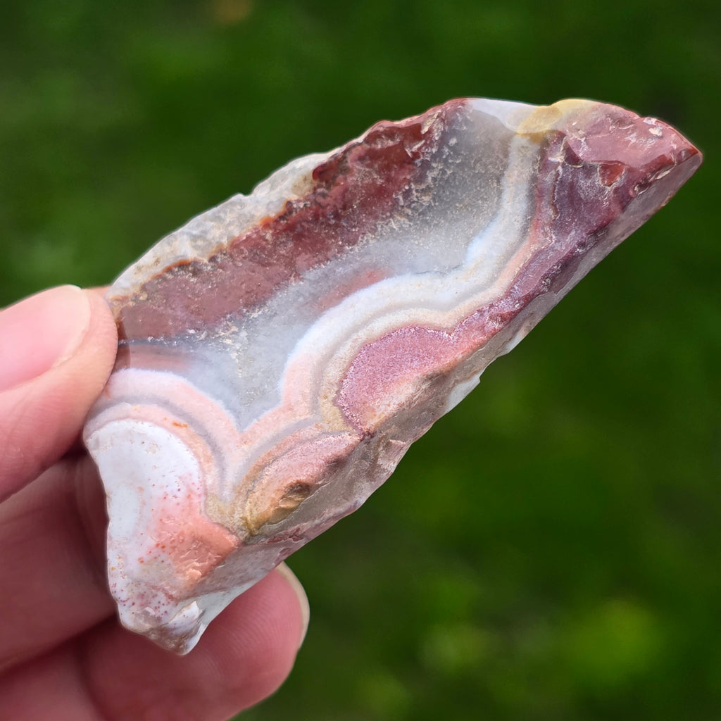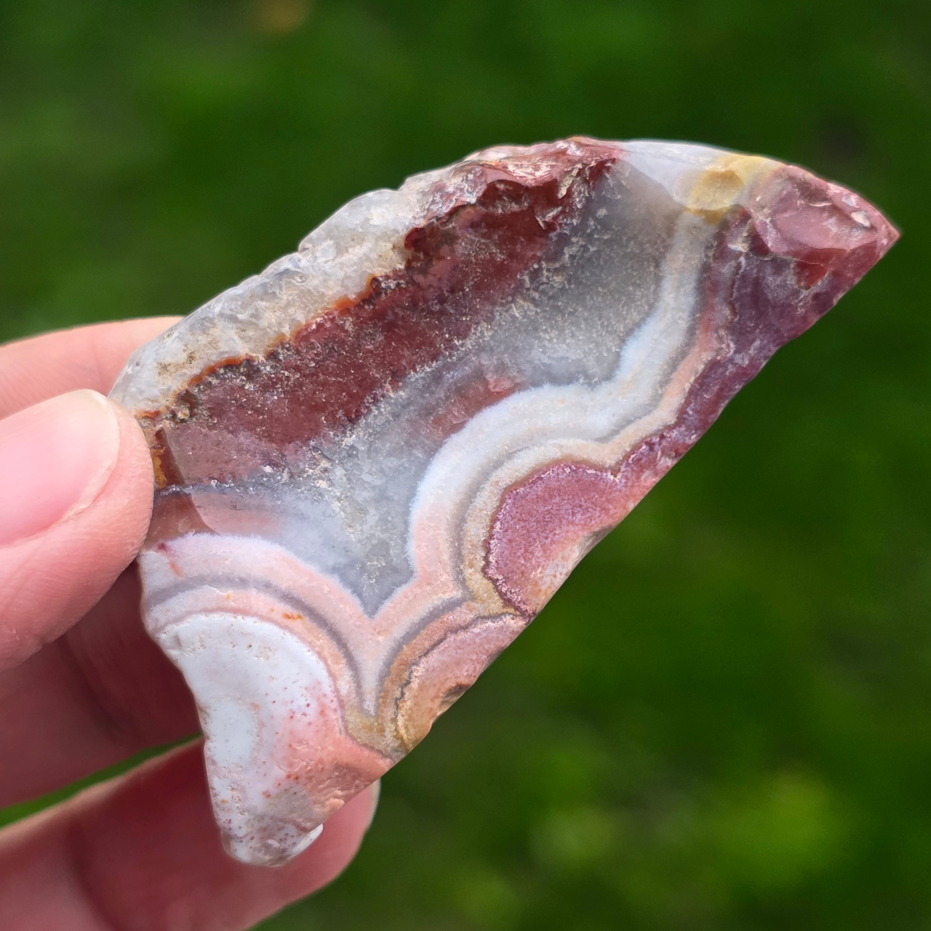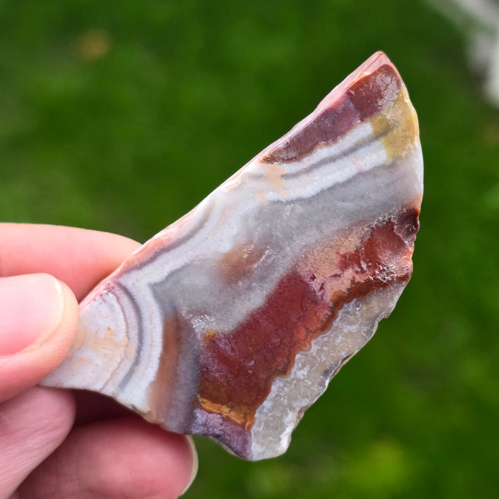 L'agate Crazy du Mexique est l'une des variétés d'agate les plus vibrantes et spectaculaires, célèbre pour ses lignes ondulées et ses jeux de couleurs fous qui semblent dessinés à main levée, sans règles. Dans cette tranche naturelle, petite mais extrêmement expressive, toute l'histoire de la pierre se révèle : des strates terreuses, des nuances chaudes de caramel, rouge vif, orange, gris et crème, mélangées en motifs spiralés qui semblent vibrer de vie.